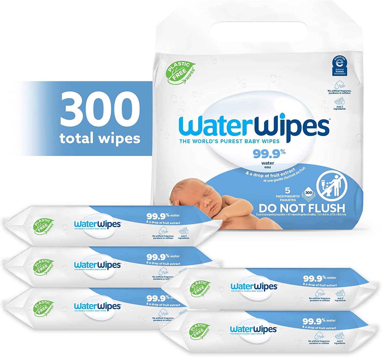 Families can trust WaterWipes Original baby wipes 300 count (5 packs) to gently clean and help protect sensitive skin. Our new Plastic-Free Original wipes are the same formula and purity as before, with just 2 ingredients: 99.9% ultra-purified water and a drop of fruit extract to naturally cleanse the skin. Our purified water goes through a 7-step process that makes it purer than tap, boiled or medical grade water to provide a deeper, more effective clean.* Our WaterWipes are unscented, hypoallergenic and gentle enough for the most sensitive premature, infant and newborn skin. WaterWipes was created by a father, inspired by a daughter. Our founder developed WaterWipes after his newborn suffered from bad diaper rash, and he realized skin this pure needs care that’s just as pure. So, he created the world’s purest wipes to help protect his child and help other parents do the same for theirs. Now families around the world trust pure and simple WaterWipes for all kinds of messes. These plastic-free wipes are gentle on the planet, and they’re clinically proven to be kind on baby’s skin, giving parents the confidence to help protect their children in the purest way possible. *When compared to cloth and water.