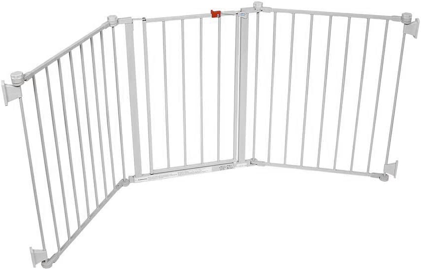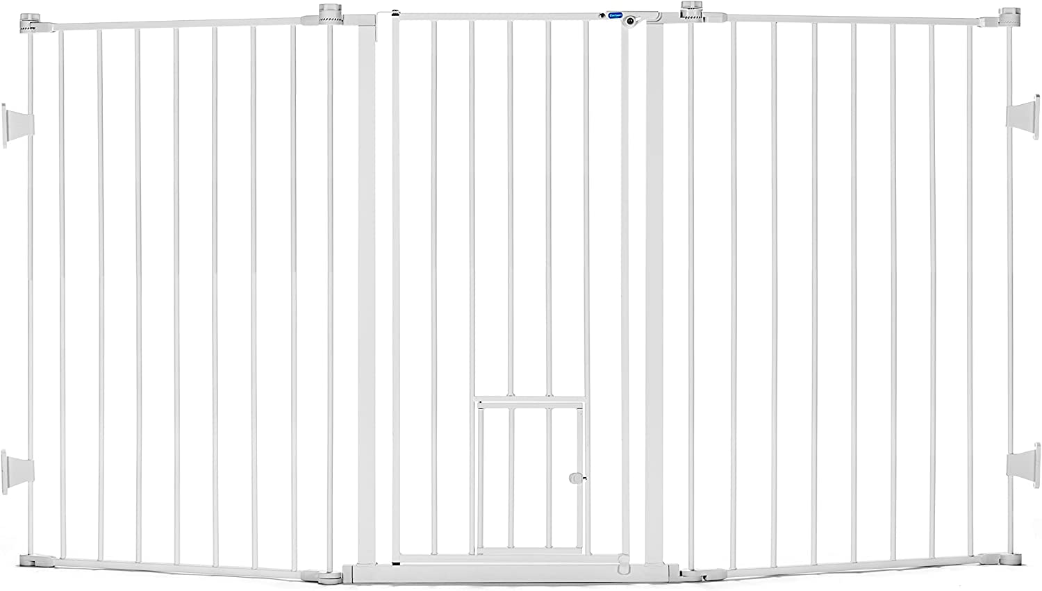 The Carlson Flexi Pet Gate is a unique, chew-proof, gate to fit homes with unusually shaped or angled openings. The all-steel frame can be arranged into a variety of ways to fit odd-shaped openings spanning from 50”-76” wide. The extra tall gate stands 38" tall. The hardware-mount gate also features a walk-through door. It also features a 9” x 9” door letting small animals pass through while keeping everyone else out.