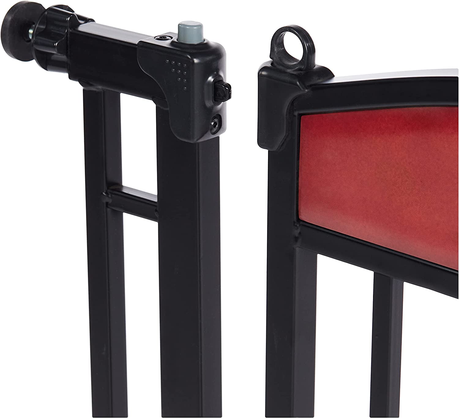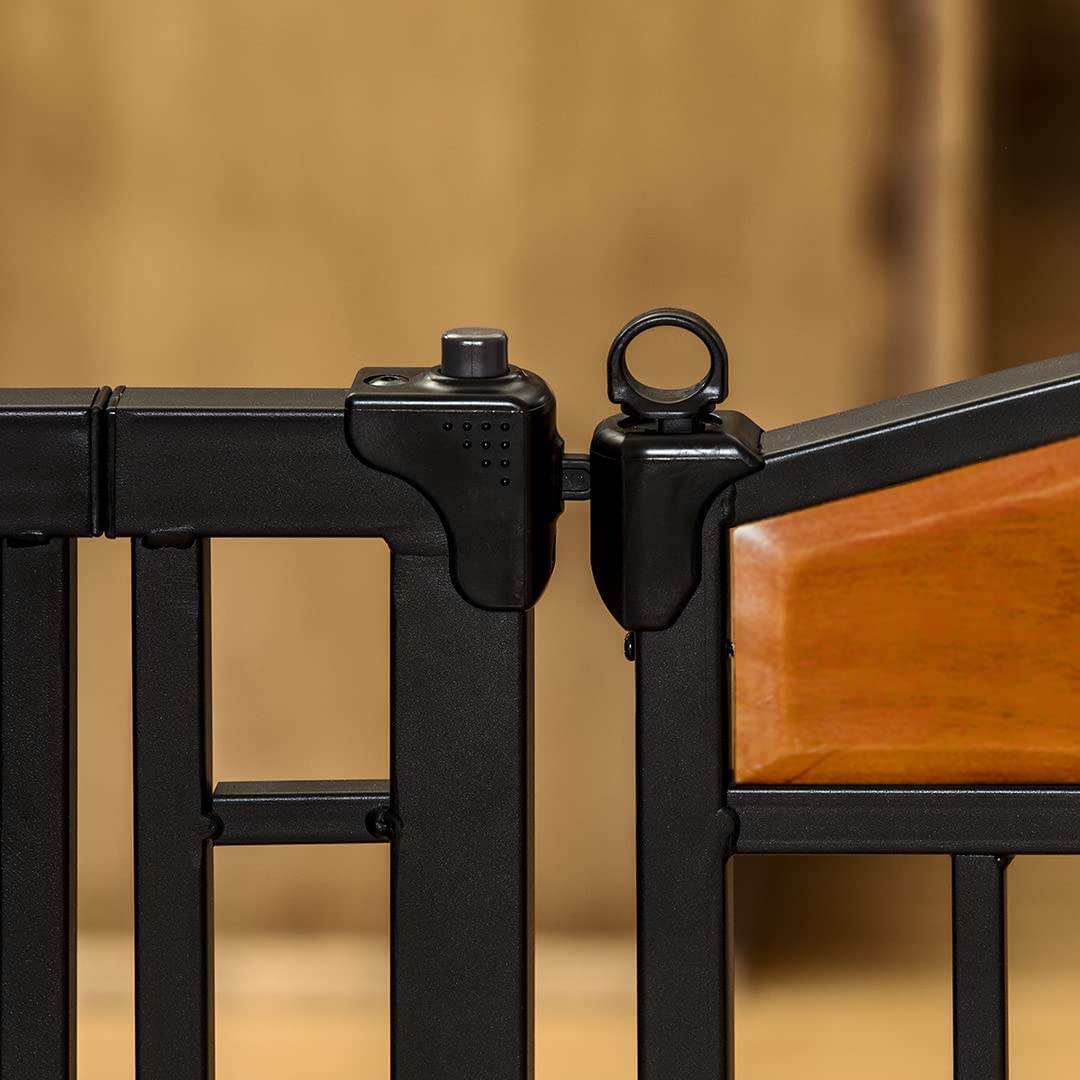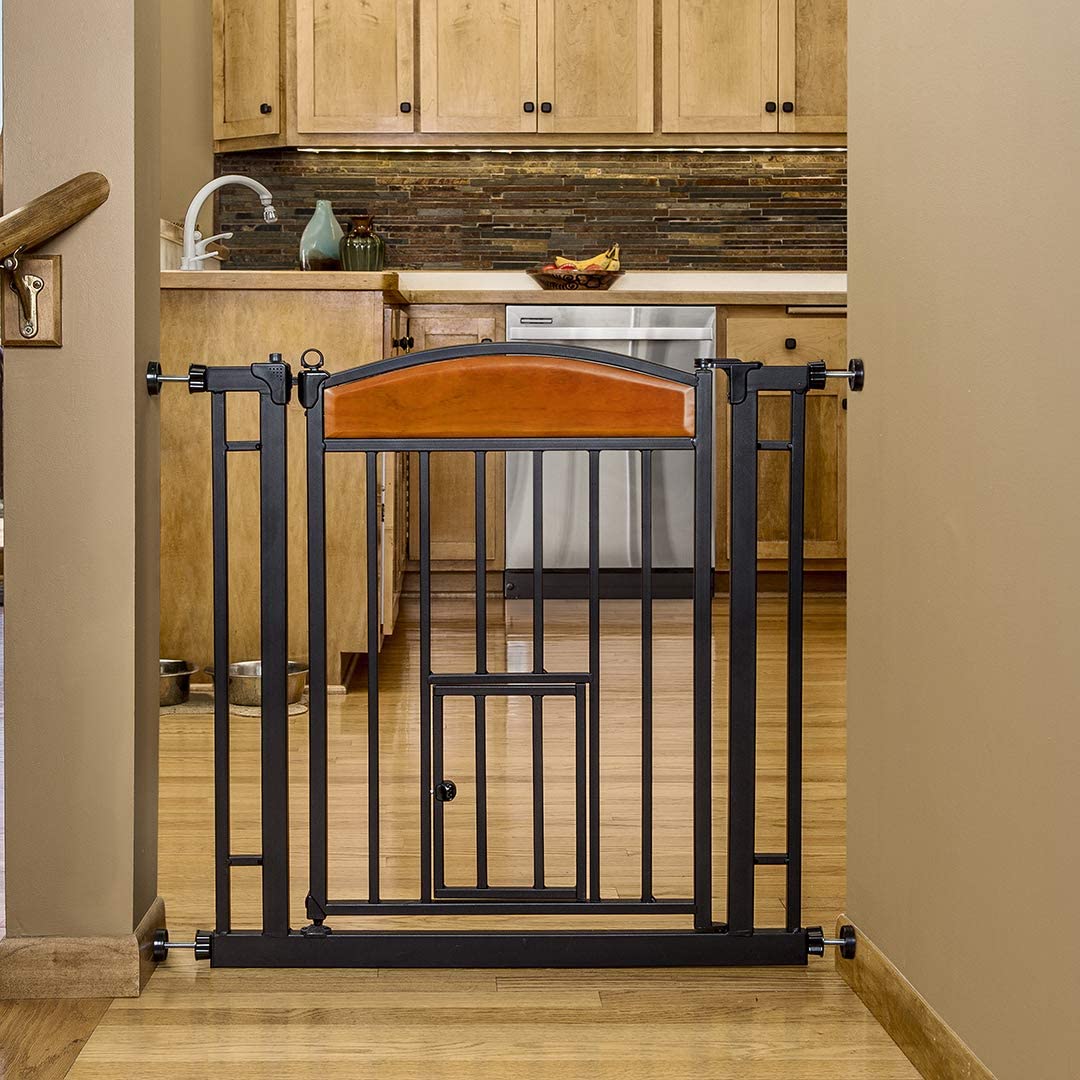 Design Studio Auto Close Wood Walk Through Pet Gate by Carlson Pet Products. The most trouble-free gate available on the market is now available in Carlson's Design Studio Line. Designed with the small pet door, the all-steel, "chew-proof" pet gate includes cherry wood accents and a premium black finish. The door can be opened in either direction for your convenience. The Auto-close with one hand operation feature allows for a convenient hands free close. This gate is 30 inches tall, perfect for all breeds and is 30.5-33.5 inches wide to fit a variety of openings through out the home. Additional extensions sold separately. The quick and easy pressure-mounted pet gate is super easy to install and take down and includes bumpers that are gentle on walls, leaving them scuff free. Charcoal steel with Cherry wood, model #3030.