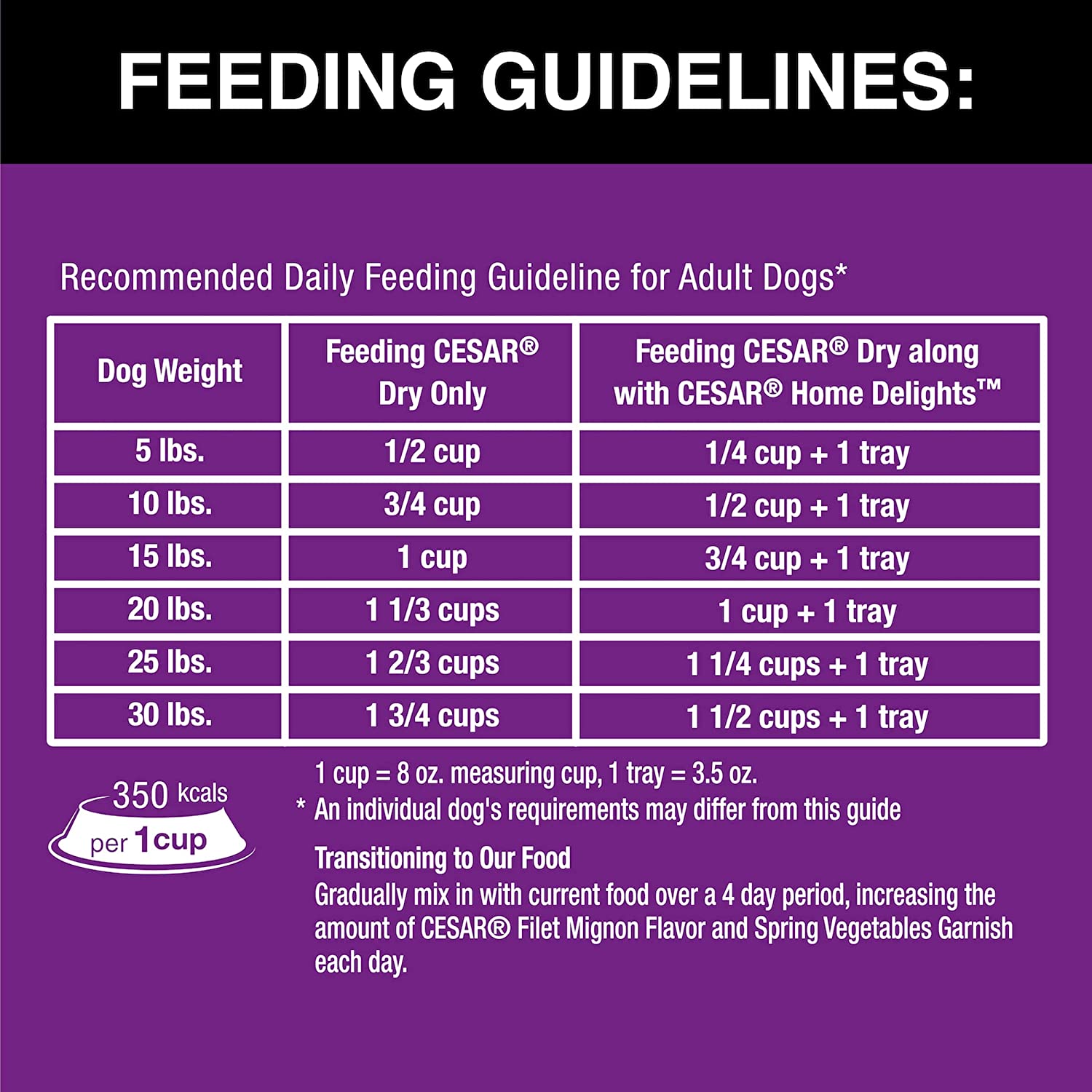 Give your dog a seat at the dinner table with CESAR Filet Mignon Flavor and Spring Vegetables Garnish Dry Dog Food. Made with real beef as the first ingredient, this gourmet dog food features tender pieces that will make your dog dance around their bowl come dinnertime. CESAR Food for Dogs is also deliciously crafted with 26 nutrients small dogs need to stay healthy. Serve your little furry companion a savory and nutritious meal with CESAR Dog Food.