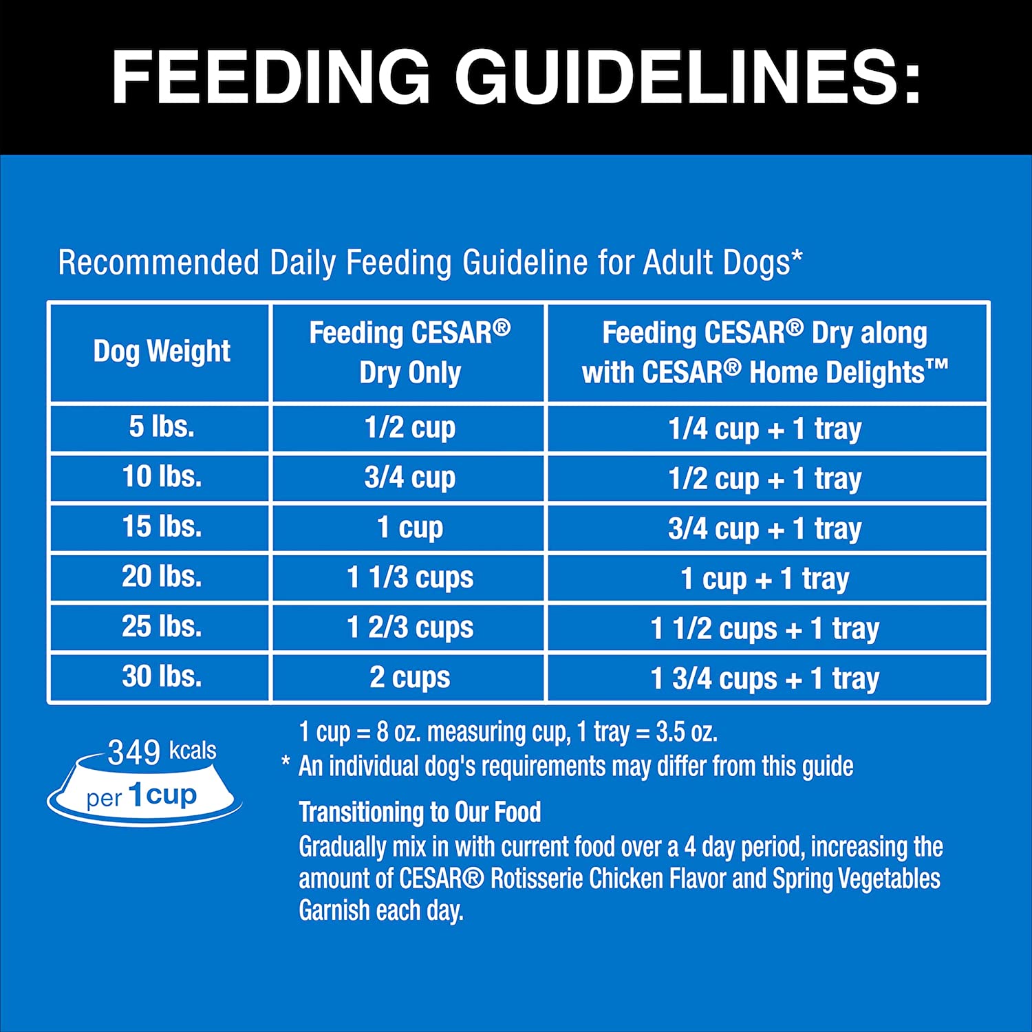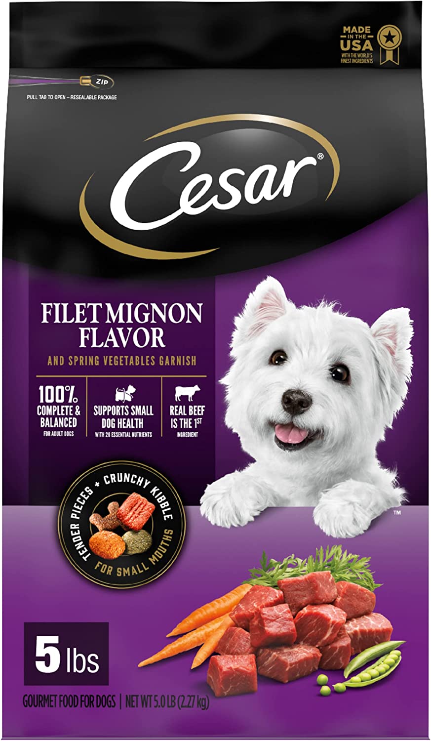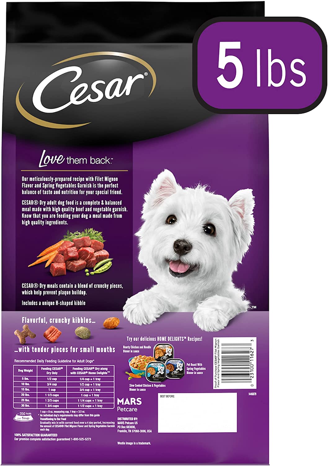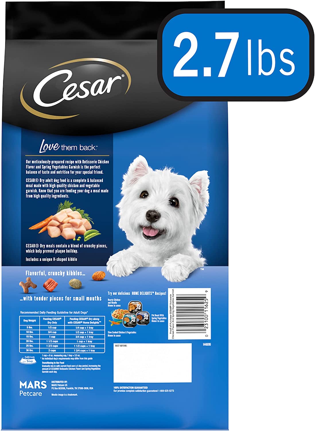 Give your dog a seat at the dinner table with CESAR Rotisserie Chicken Flavor and Spring Vegetables Garnish Dry Dog Food. Made with real chicken as the first ingredient, this gourmet dog food features tender pieces that will make your dog dance around their bowl come dinnertime. CESAR Food for Dogs is also deliciously crafted with 26 nutrients small dogs need to stay healthy. Serve your little furry companion a savory and nutritious meal with CESAR Dog Food.