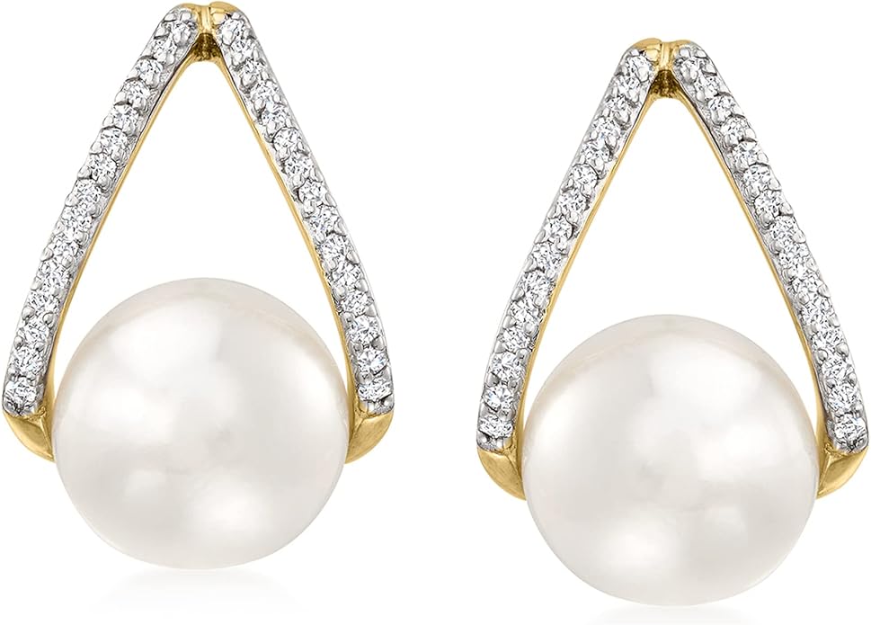 Ross-Simons 8-8.5mm Cultured Pearl and .12 ct. t.w. Diamond Drop Earrings in 14kt Yellow Gold