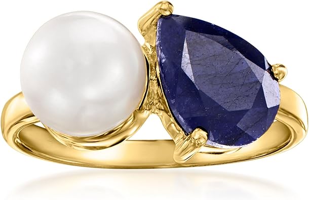 Ross-Simons 7.5-8mm Cultured Pearl and 2.80 Carat Sapphire Toi Et Moi Ring in 18kt Gold Over Sterling