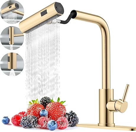 Brushed Gold Single Hole Kitchen Sink Faucets with Pull Down Sprayer, Single Handle, High Flow Water, Pull Out Tap, Stainless Steel Tall Kitchen Faucet, Touch On for Effortless Control and Durability