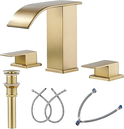 Waterfall Bathroom Faucet 3 Hole, Brushed Gold 8 Inch Widespread Bathroom Faucets & Parts, Modern 3 Piece Bathroom Sink Faucet, Touch On Lavatory Faucet for Bathroom Vanity, Curved Spout