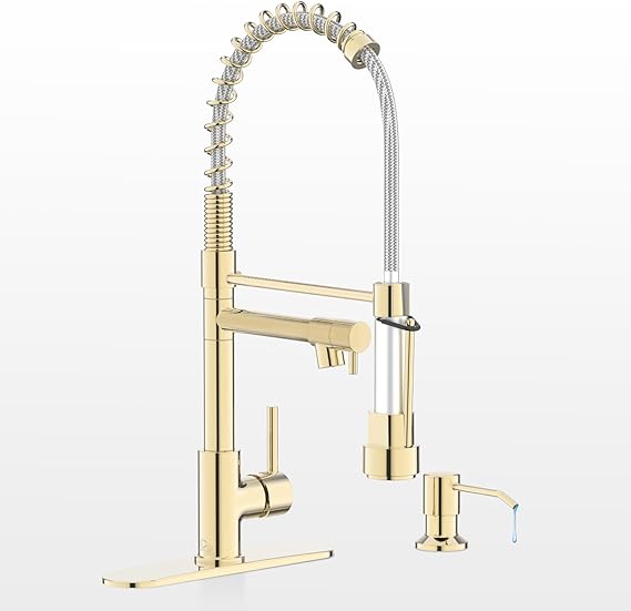 Gold Kitchen Faucet, Kitchen Faucet with Soap Dispenser, Kitchen Sink Faucet with Dual Function Spray Head and Deck Plate, 4 Hole Camper Farmhouse RV Sink Faucet with Sprayer
