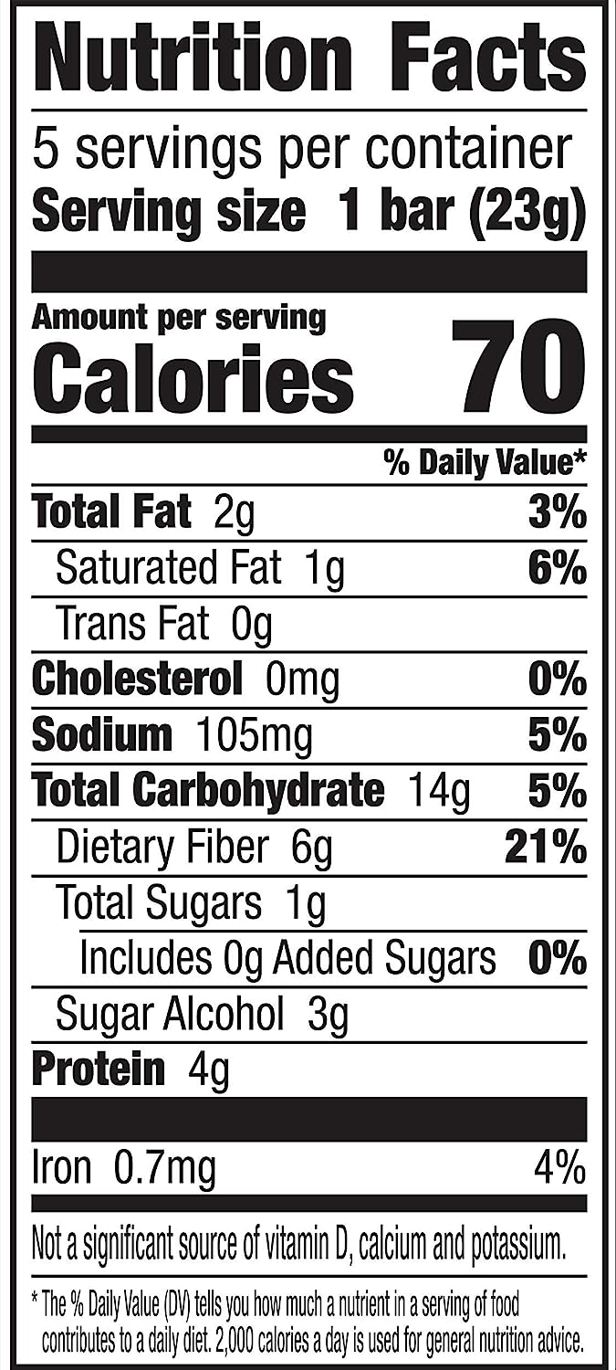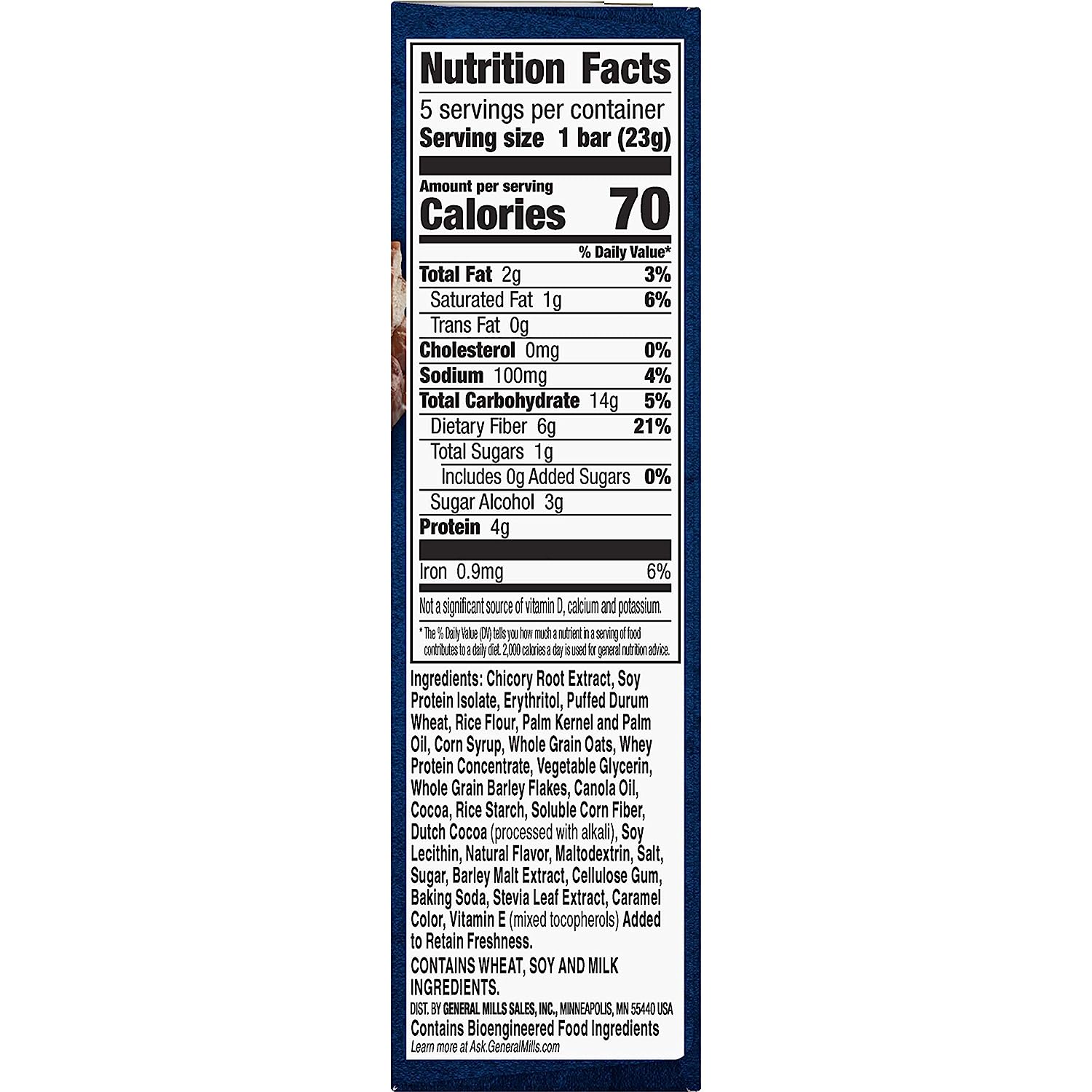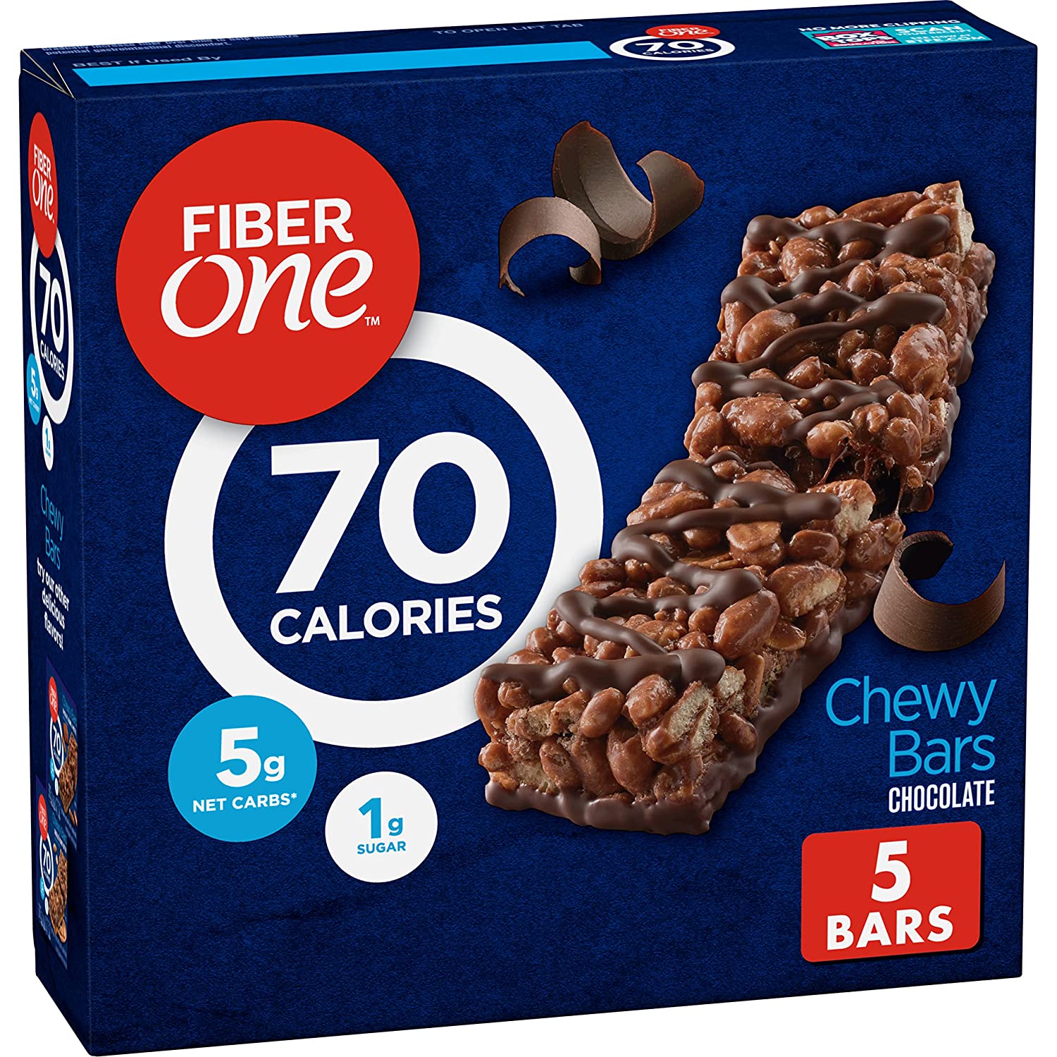 Fiber One 70 Calorie Chewy Snack Bars provide an indulgent snack without any of the guilt. Rich chocolate caramel, pretzel pieces, and hearty oats help satisfy your cravings without sacrificing your healthy lifestyle. Each fiber bar contains at least 20% daily value of fiber so you'll feel like one smart cookie when you say 'yes' to your sweet tooth. Diets high in fiber can help keep your digestive system on track. Choose Fiber One Chewy Granola Bars for your breakfast bars, office snacks or as an on-the-go treat. Contains 70 calories, five grams net carbs, and one gram sugar per serving for a snack to keep you going. Contains five bars total.
