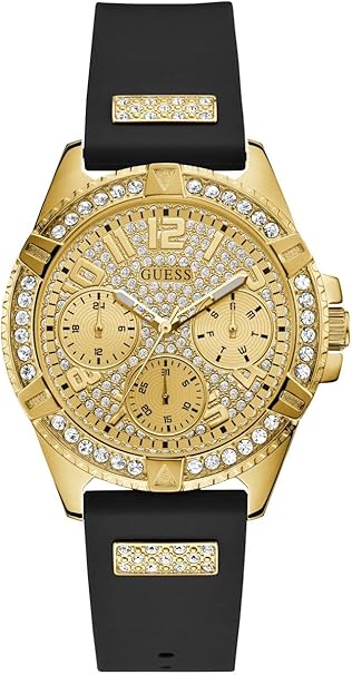GUESS Gold-Tone Stainless Steel Crystal Encrusted Dial with Black Stain Resistant Silicone Watch (Model: U1160L1)