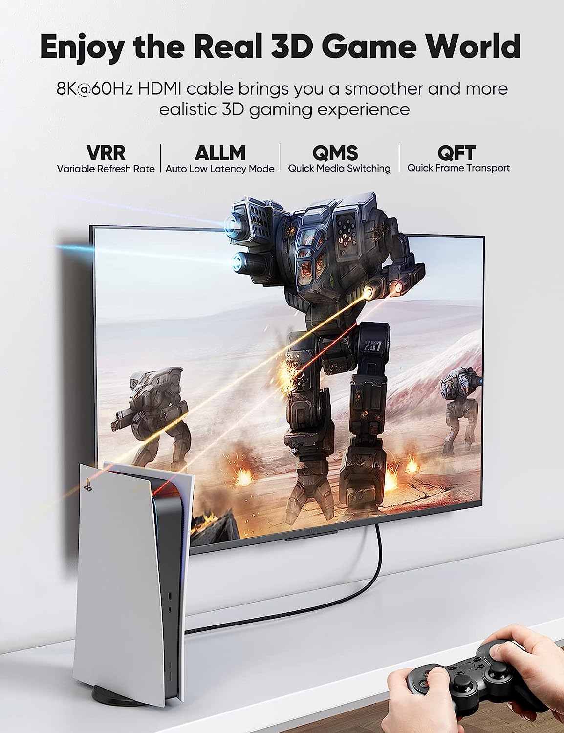 • 【4K@120Hz for Gaming】:HDMI 2.1 cable is designed for gaming enthusiasts, it can help you achieve a super smooth picture of 4K@120HZ for gaming. Its latest game mode supports variable refresh rates(VRR), maximizes the value of the graphics card and CPU, and is more accurate in the processing of rendered images. Variable Refresh Rate and Quick Media Switching (QMS)reduce lag, motion blur, frame tearing so that you can achieve smoother delay-free gaming and real-time interactive virtual reality