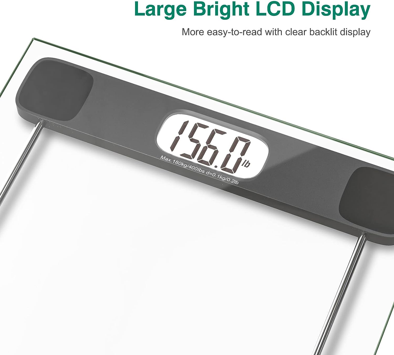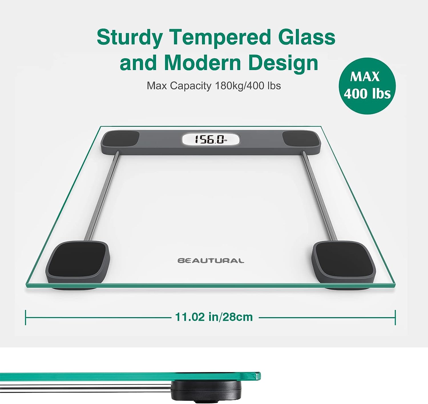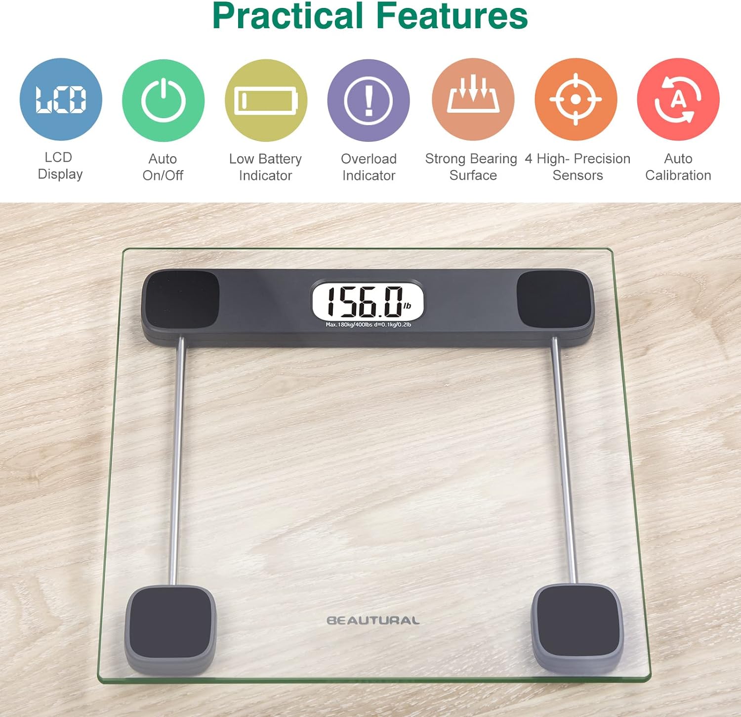 BEAUTURAL Digital Bathroom Scale for Body Weight, LCD Display, 400lb, 4 AAA Batteries and Tape Measure Included,Tempered Glass