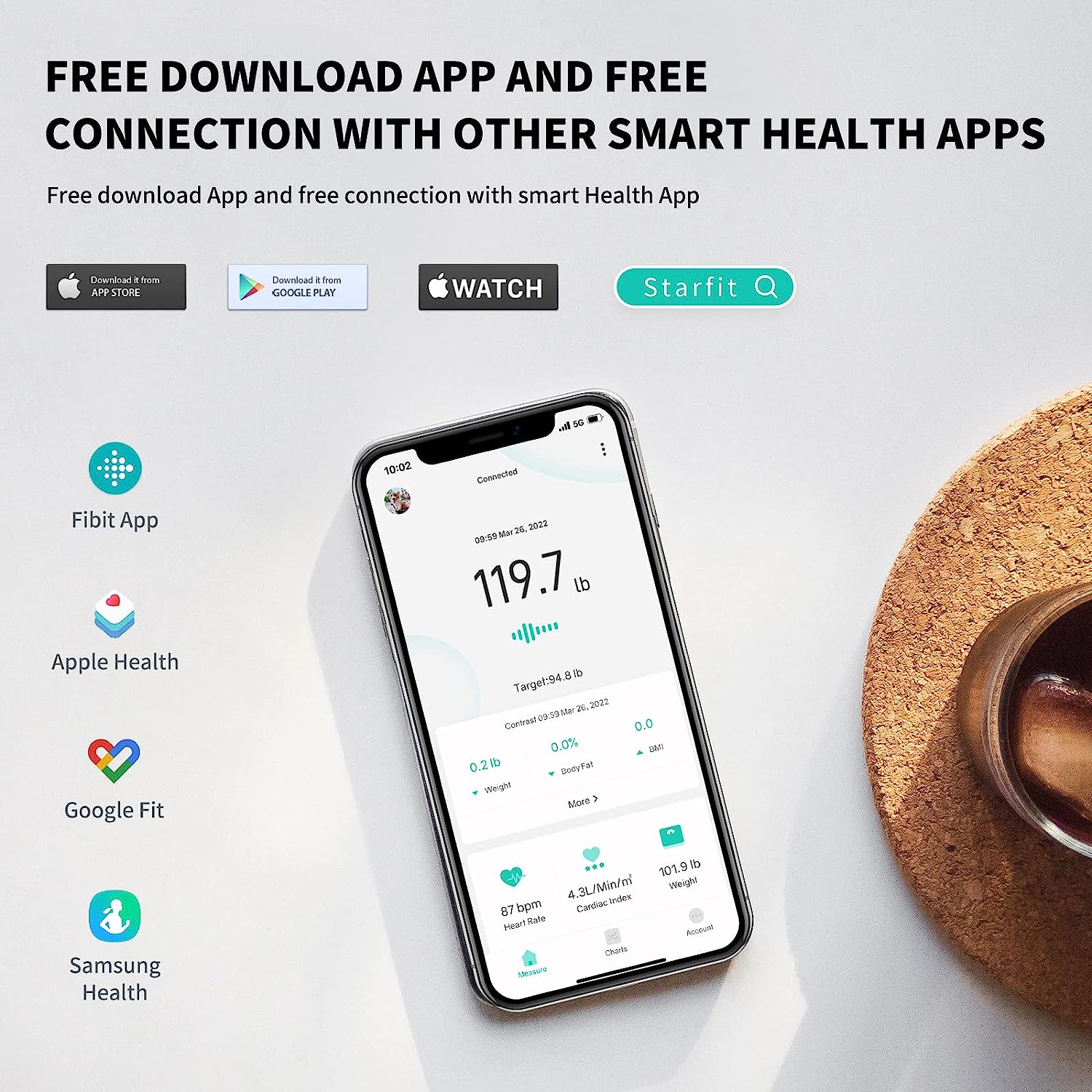 • Easily sync with Health Apps. Free download FITDAYS app from app store or Google play, and FITDAYS app can easily sync with Apple Health, Google Fit, Samsung Health, Fitbit and so on, which let you store and share your data more conveniently. Smart phones can bind and record all the changes automatically with this scale.