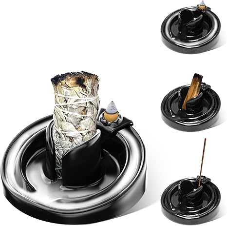 5 in 1 Incense and Candle Holder - Backflow Incense Holder for Burning Sage, Palo Santor - Ceramic Incense Holder Ash Catcher Tray for Meditation Room - Easy to Clean (Black)