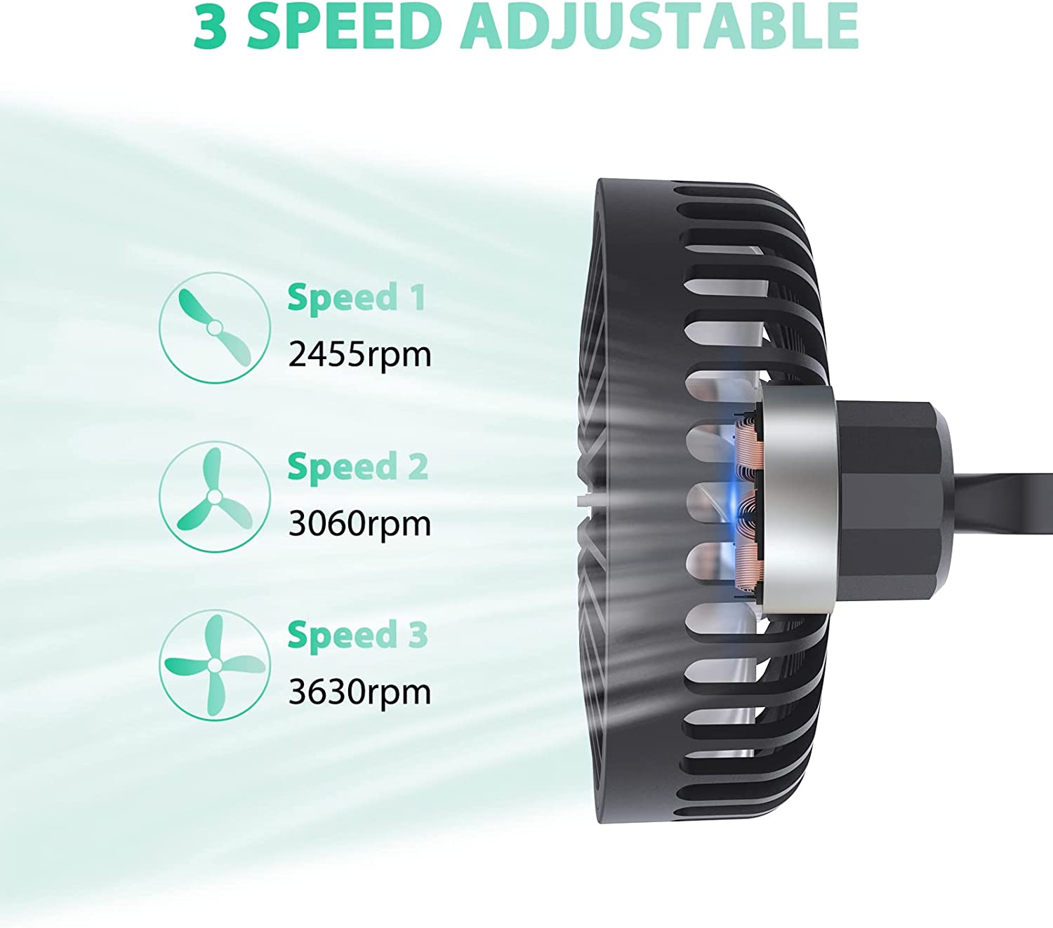 • 【Strong Wind & Ultra Quiet】3-Speed wind setting, you can choose the right gear according to your needs. The maximum rotation speed is about 4000rpm, which is very powerful compared to its small size. The car fan for the backseat has a built-in brushless motor and the fan works very quietly with low noise close to 30dB, which won't disturb the passengers who are at rest.