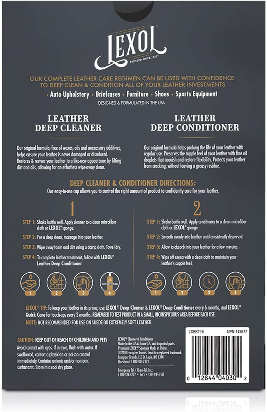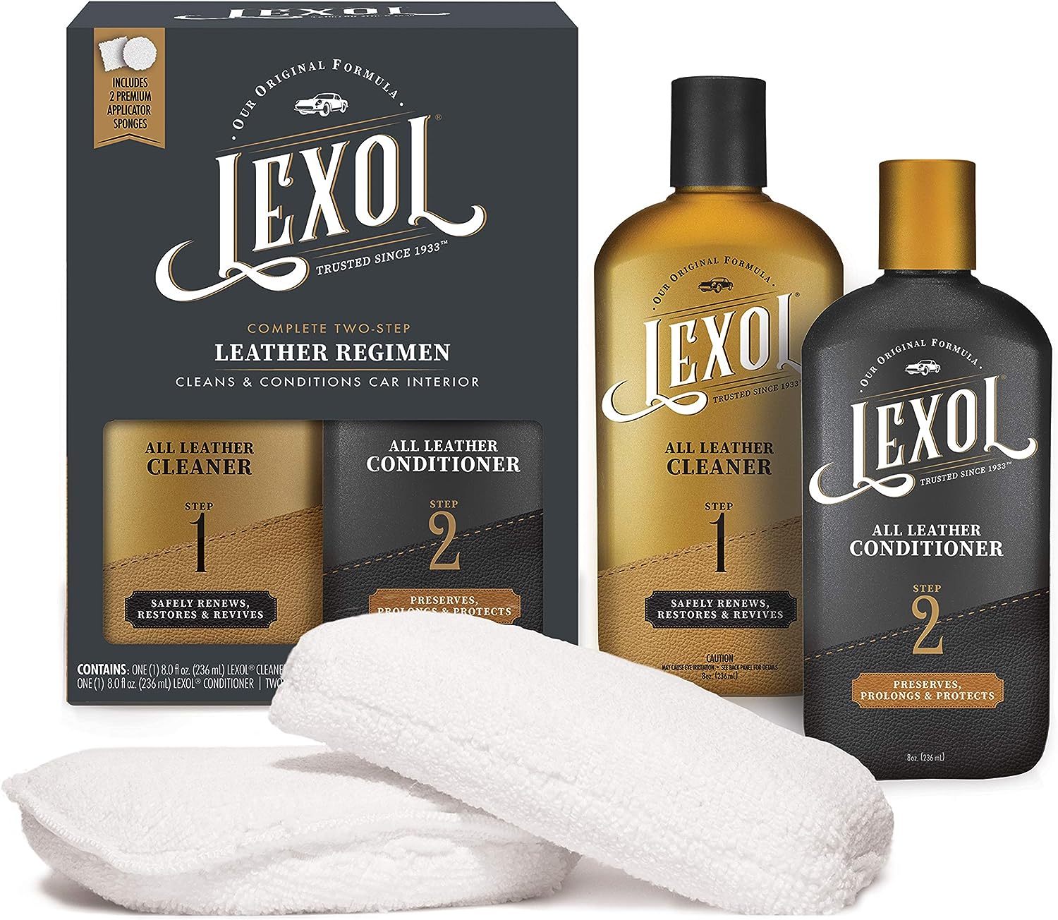Lexol Leather Conditioner and Leather Cleaner Kit, Use on Car Leather, Furniture, Shoes, Bags, and Accessories, Trusted Leather Care Since 1933, 8 oz Bottles, Includes Two Application Sponges, Black.