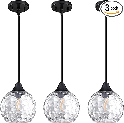 3 Pack 1 Light Hanging Indoor Kitchen Island Pendant Light 7" Clear Hammer Glass Pendant Ceiling Light Fixtures Black Finish Modern Farmhouse Dinning Over Sink