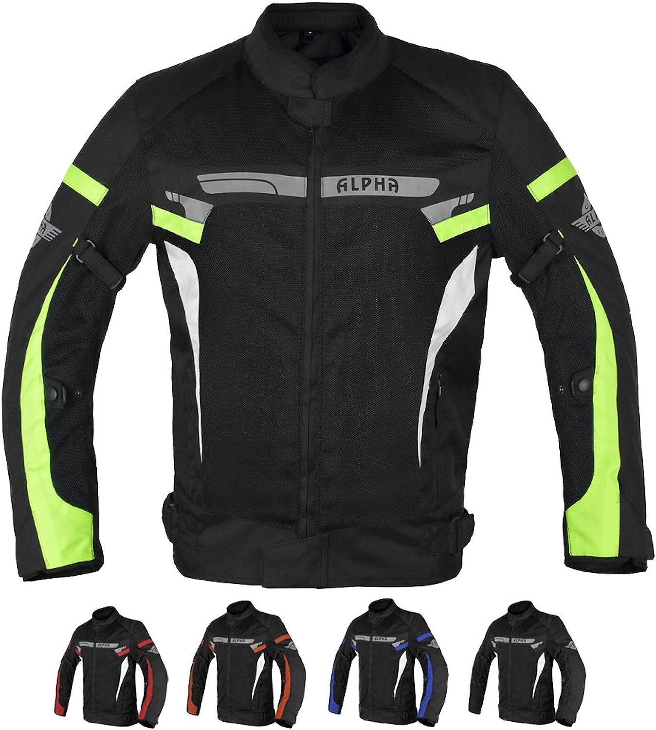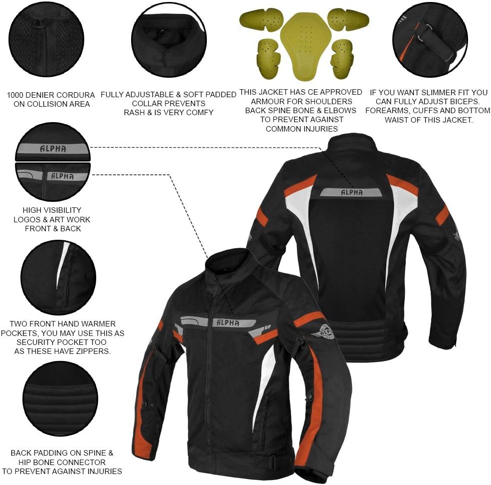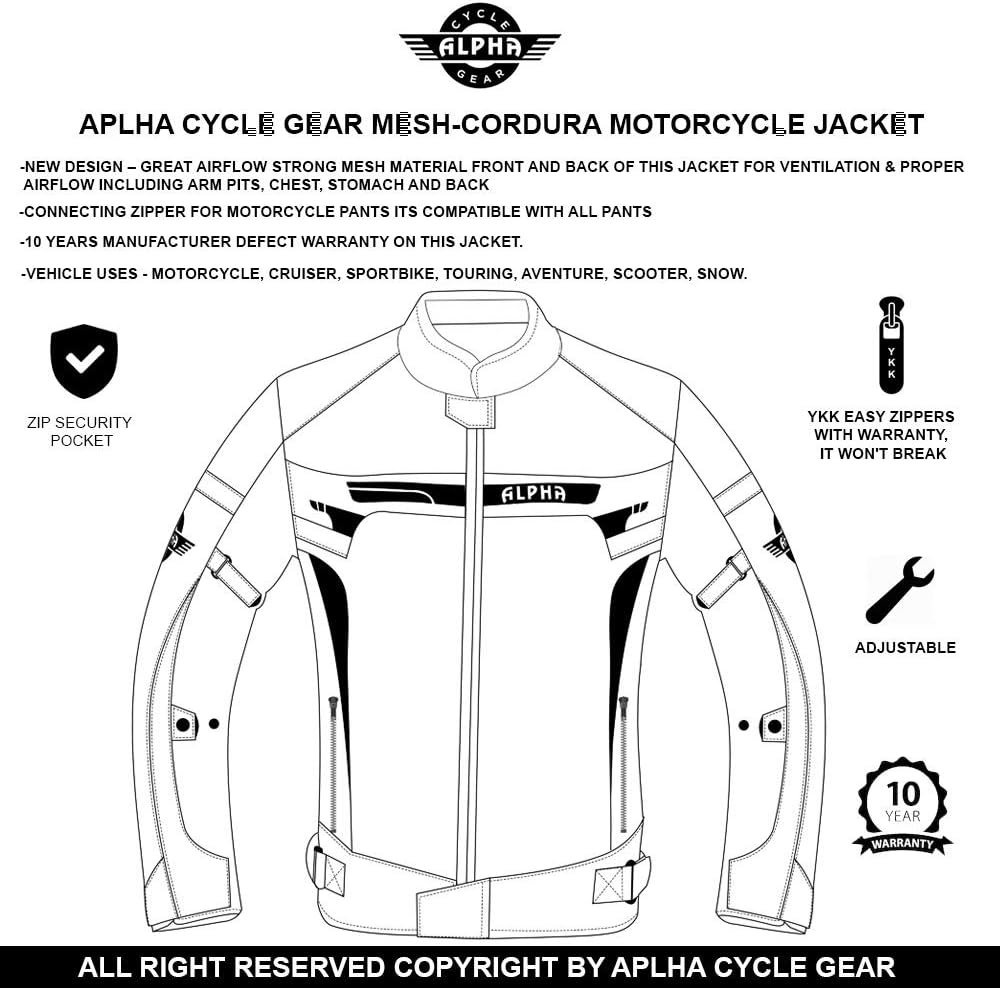 INTRODUCING ALPHA CYCLE GEAR (SINCE 1992) IN USA, YEARS OF EXPERIENCED BIKERS HARD WORK BRINGING YOU TOP NOTCH HIGH QUALITY GEAR WITH EXCEPTIONAL PRICES. WE BACK OUR QUALITY AND OFFER 10 YEARS OF WARRANTY ON ALL OF OUR ALPHA CYCLE GEAR PRODUCTS. FEATURES: 10 YEARS’ WARRANTY. 5 CE APPROVED ARMOR 2 SHOULDERS, 2 ELBOWS, 1 BACK - REMOVABLE. FULLY ADJUSTABLE ON 10 SPOTS. GET THAT CUSTOM FIT YOU WANT EASY. MESH EXTRERIOR BRINING YOU AIR FLOW FRONT/ BACK . AIR FLOW SYSTEM, NO MORE ARMPIT ODORS. HIGH VISIBILITY REFLECTED LOGOS FRONT, BACK & ARMS. MEMORY FOAM COLLAR FOR COMFORT. SEMI PROTECTION 2 LAYERS’ FOAM PADDING AT BACK OUTER CONSTRUCTION 1000 D CORDURA FABRIC ON COLLUSION AREAS. CONNECTING ZIPPER FOR MOTORCYCLE PANTS COMPATIBLE WITH ALL MOTORCYCLE PANTS. PHONE POCKET CONCEAL CARRY POCKET HAND WARMER POCKET YKK ZIPPERS –LIFETIME WARRANTY. ANY ISSUES DON’T WORRY REACH US OUT BY MESSAGING US ON AMAZON. OUR INCREDIBLE EXPERIENCED 24/7 CUSTOMER SERVICE WILL ASSIST YOU RIGHT AWAY.