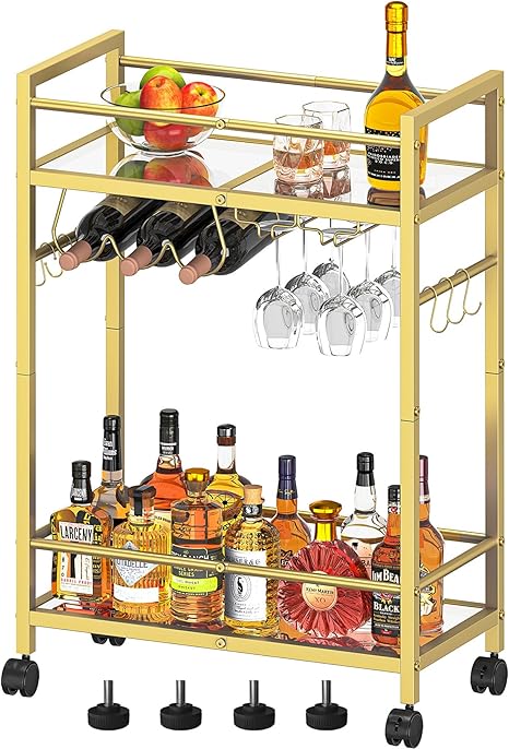 Bar Cart, Serving Cart for Home, Microwave Cart, Drink Cart, Wine Cart with 2 Mirrored Shelves, Wine Holders, Glass Holders, for Kitchen, Dining Room(Gold)