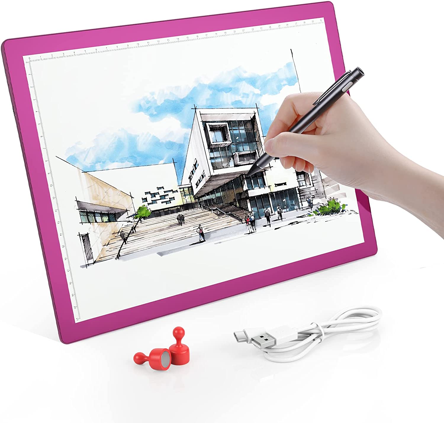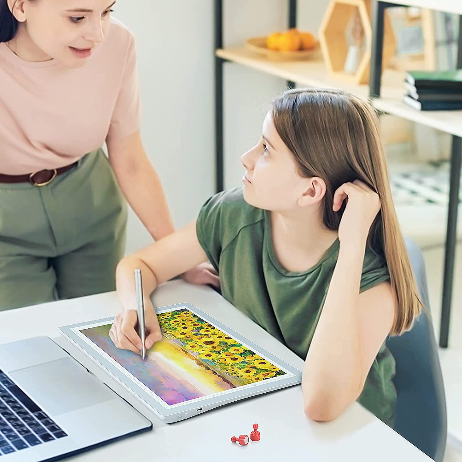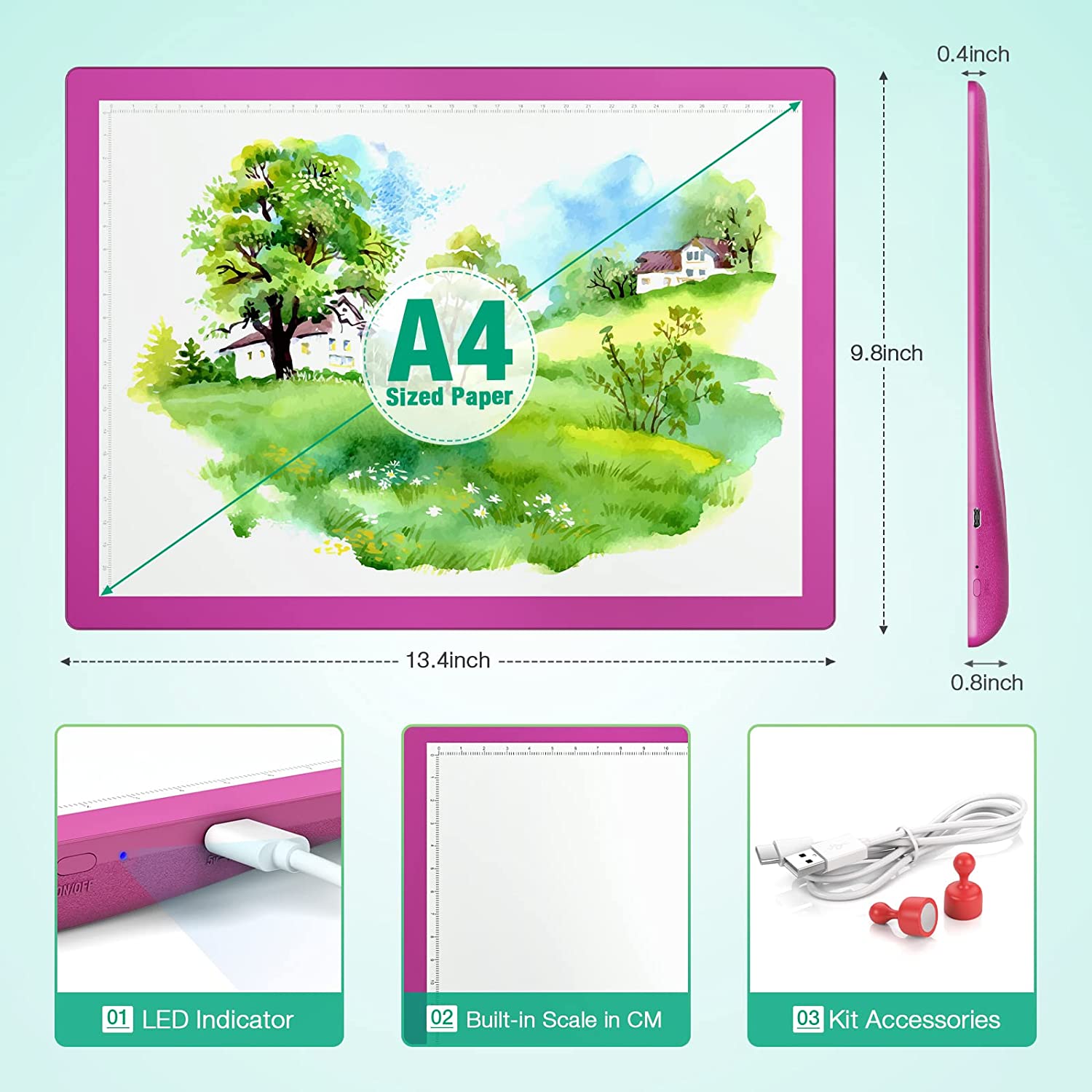 • STABLE MAGNETS & TILT ANGLE: 2 margnetic pins are available for you to hold the paper on the surface of the light box and keep it from moving. The backside of copy board is of 8 degree tilt which is ergonomics and make you feel soft during long-time painting.
