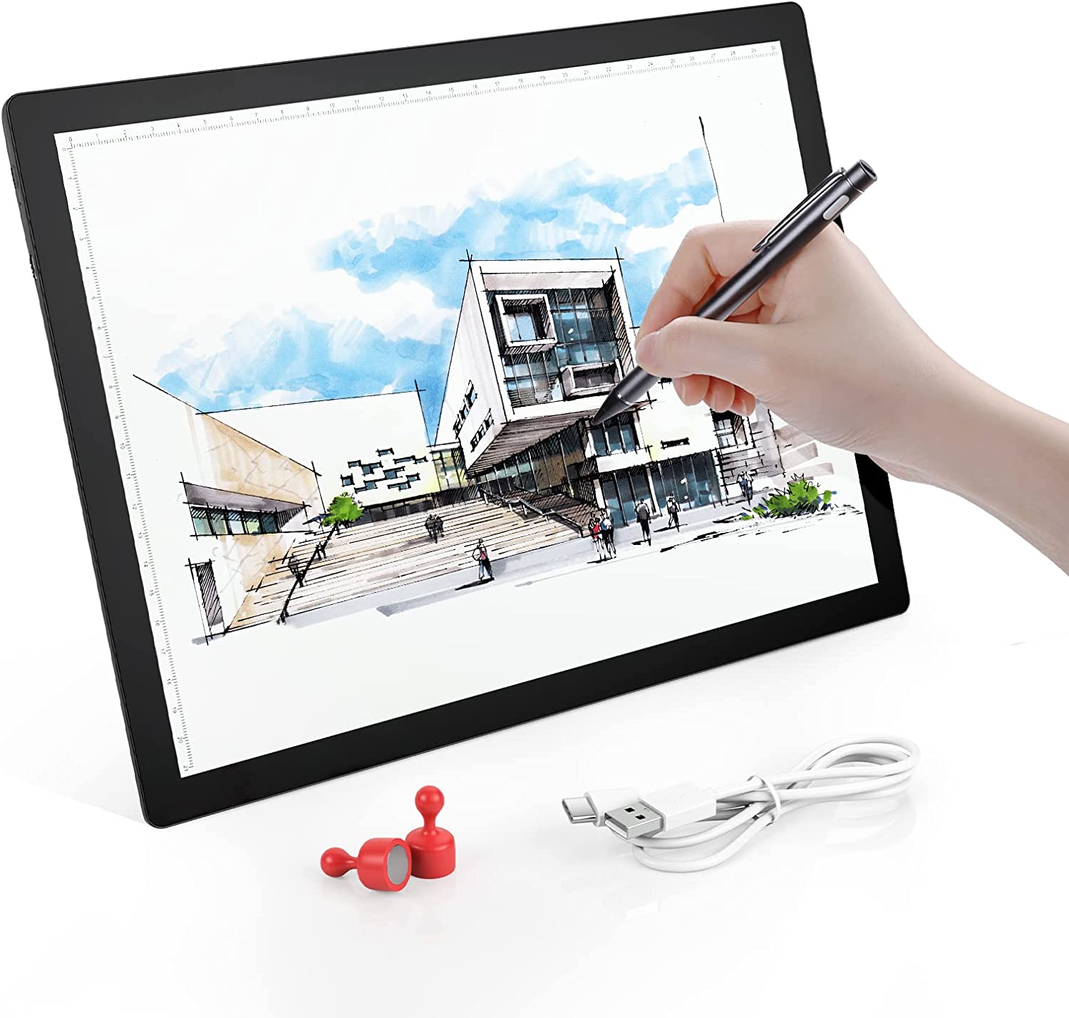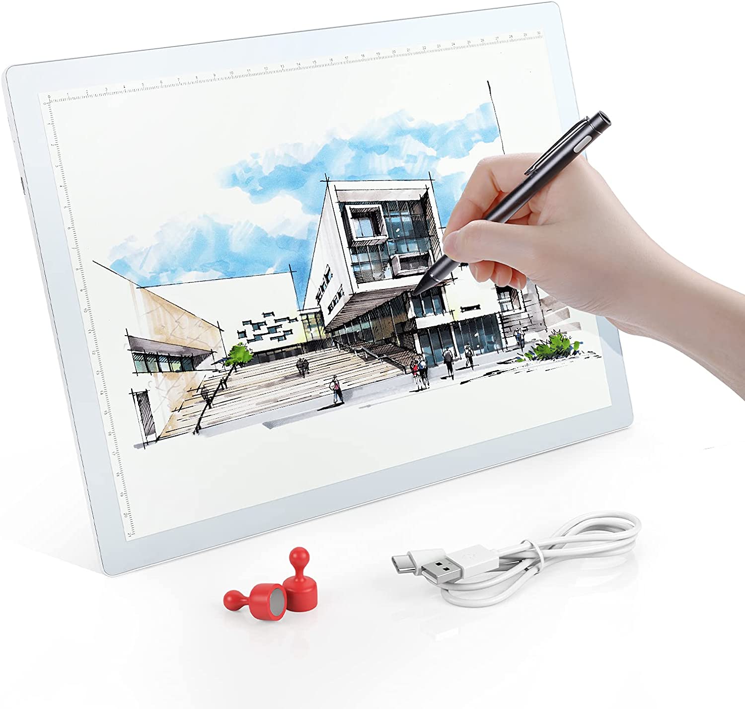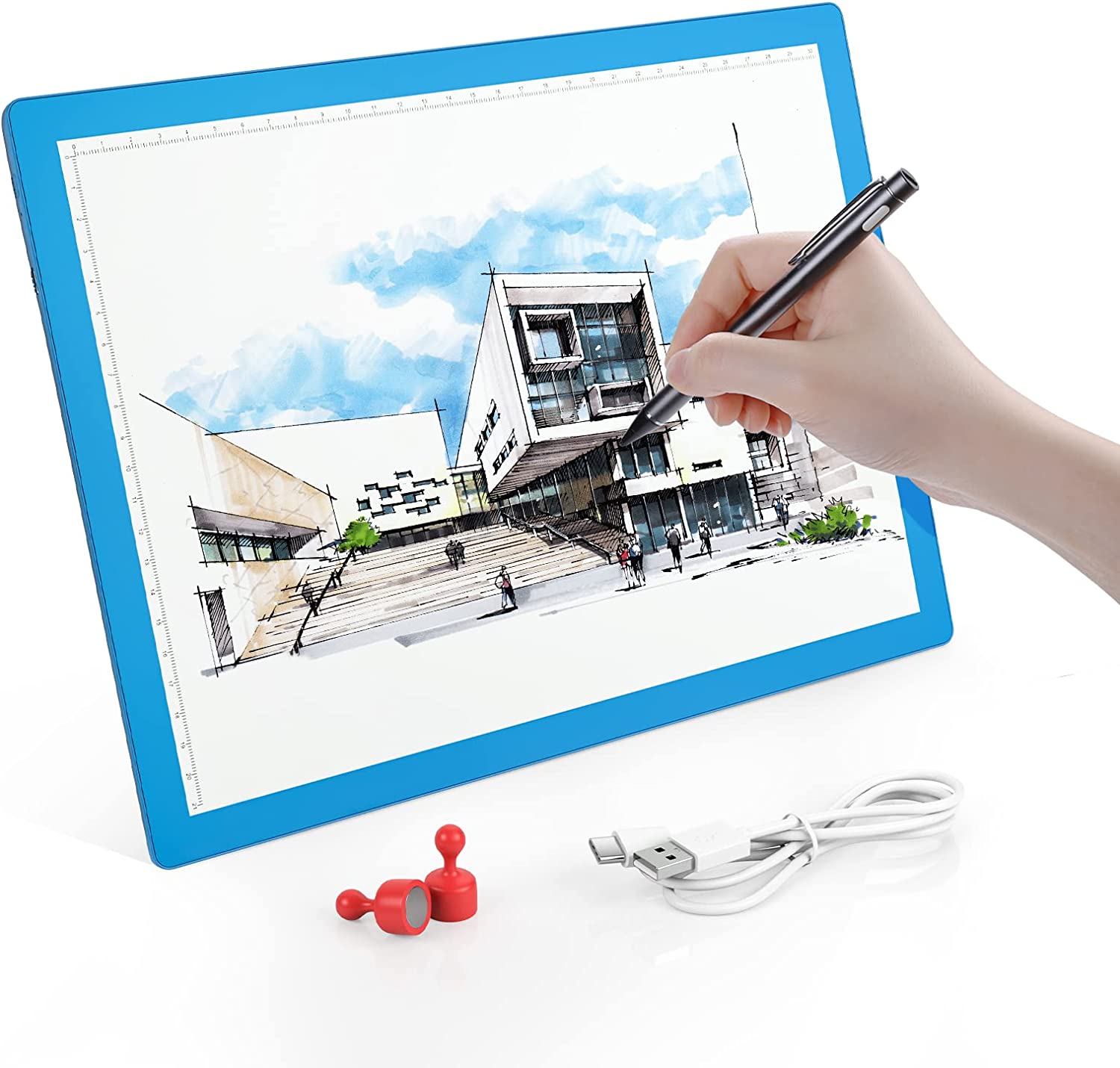 • STABLE MAGNETS & TILT ANGLE: 2 margnetic pins are available for you to hold the paper on the surface of the light box and keep it from moving. The backside of copy board is of 8 degree tilt which is ergonomics and make you feel soft during long-time painting.