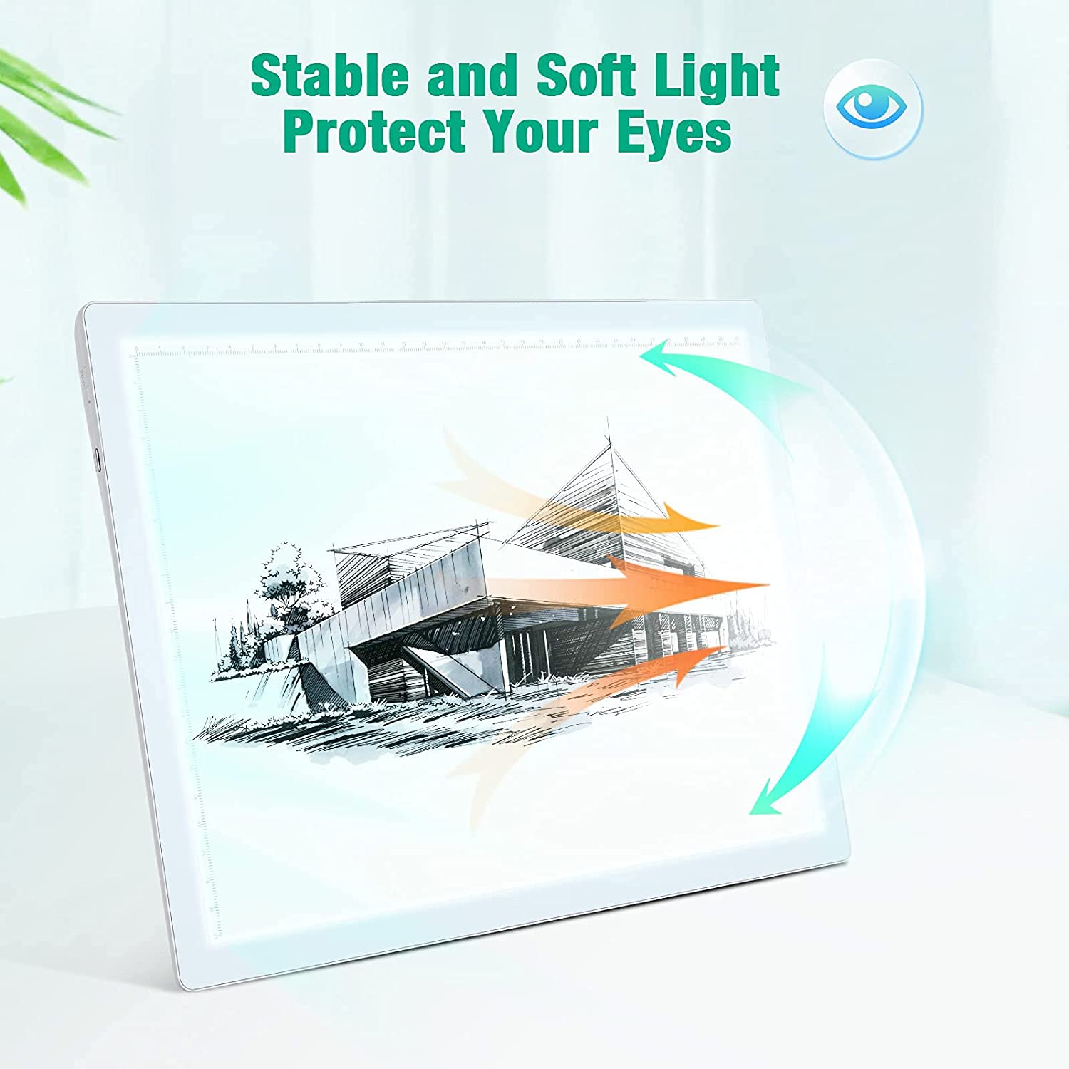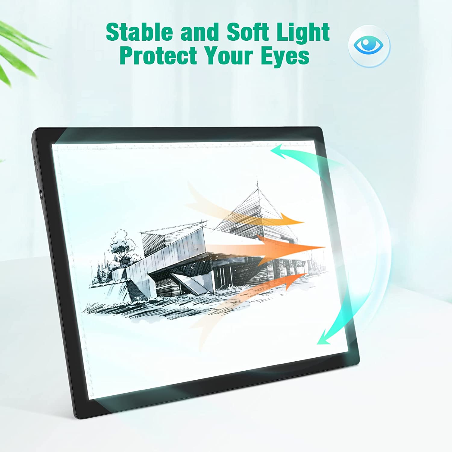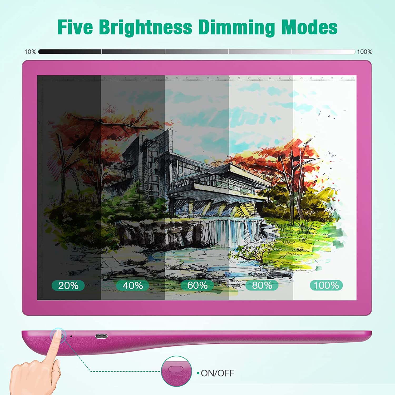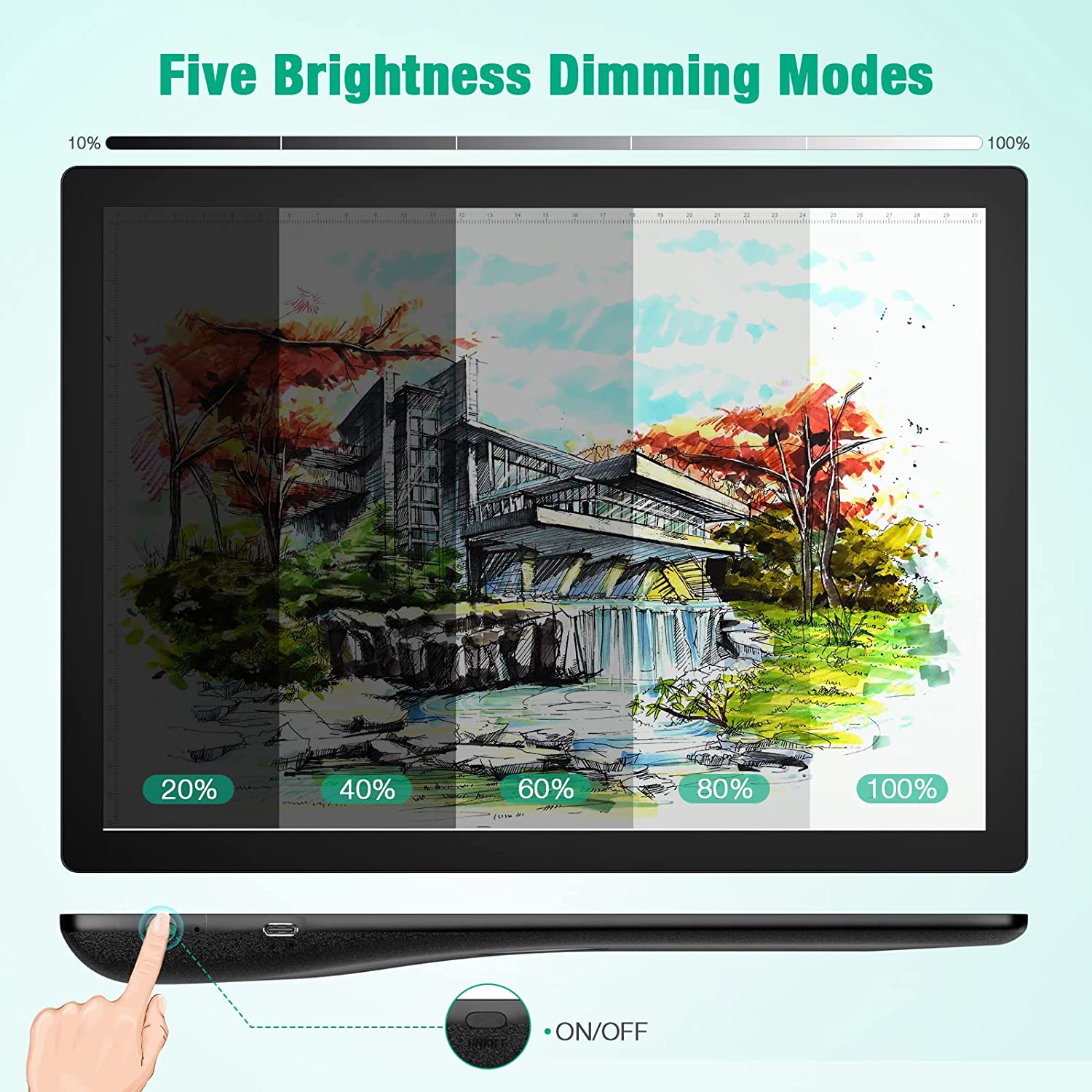 • 5 LEVELS BRIGHTNESS CONTROL: The brightness of the tracing light pad can be adjusted by 5 different levels to match the ambient brightness of your background. Soft light will not make your eyes tired after long-hour working, press and hold the button to adjust the brightness based on your comfort and need.