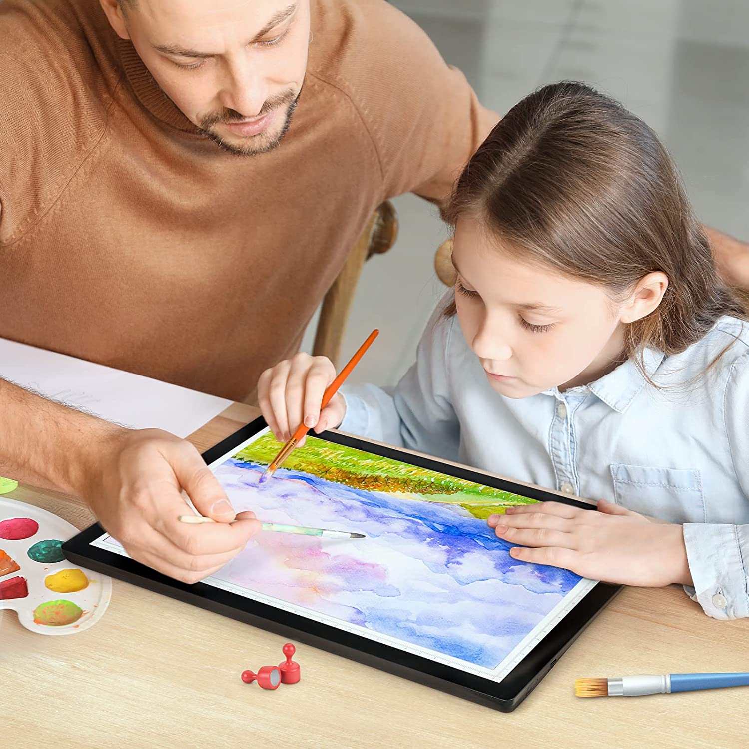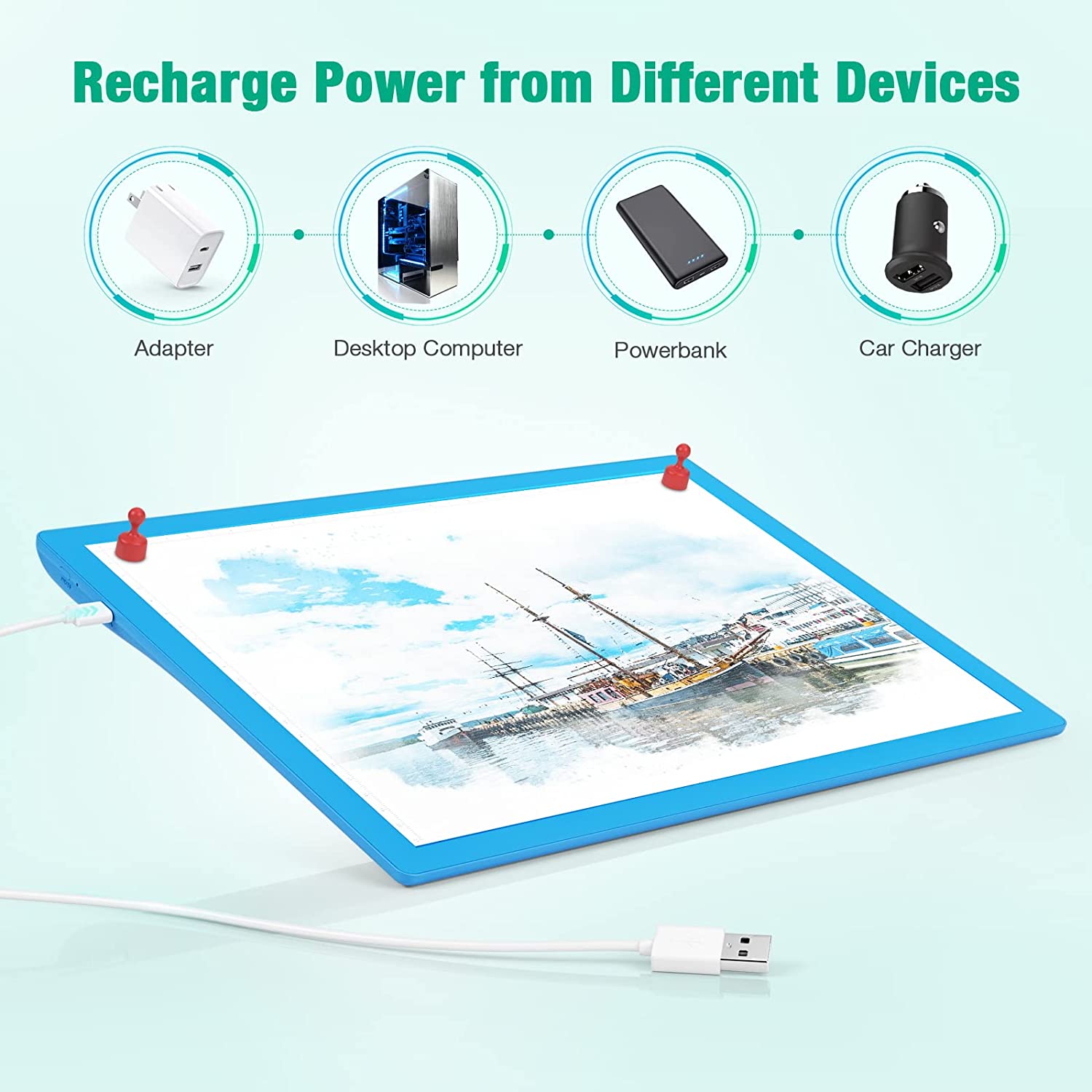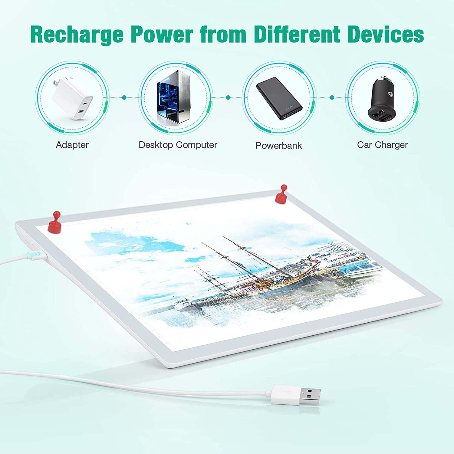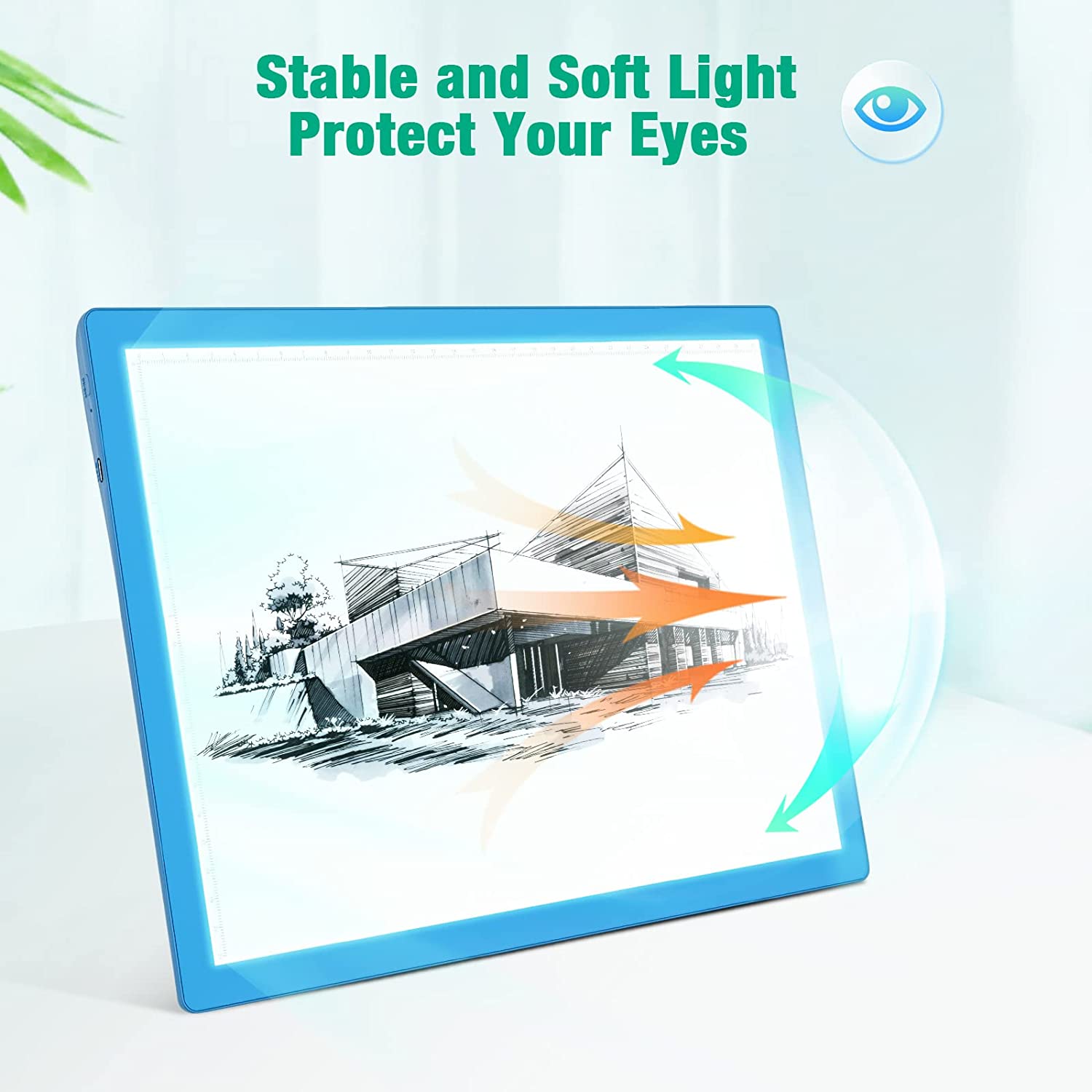 • 5 LEVELS BRIGHTNESS CONTROL: The brightness of the tracing light pad can be adjusted by 5 different levels to match the ambient brightness of your background. Soft light will not make your eyes tired after long-hour working, press and hold the button to adjust the brightness based on your comfort and need.
