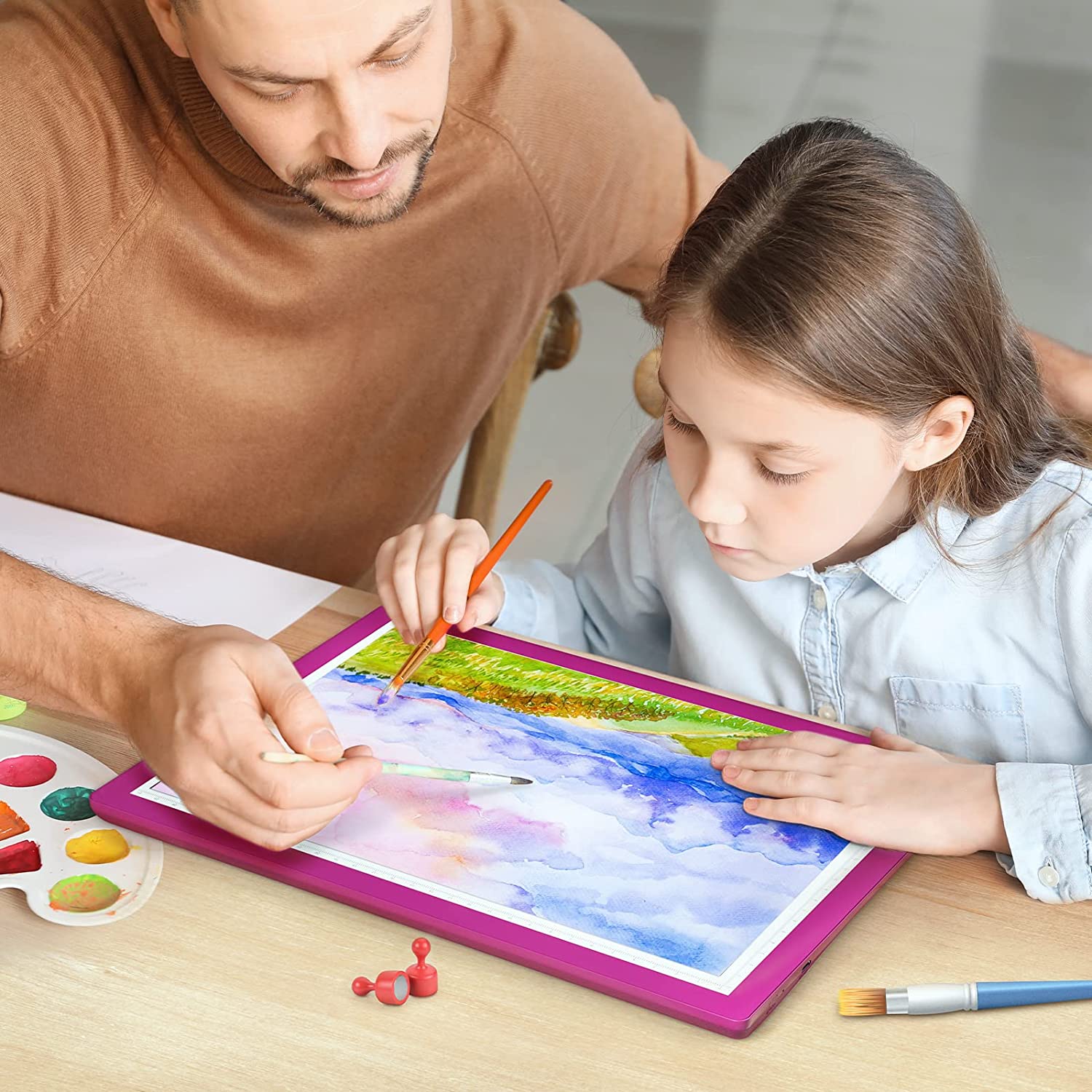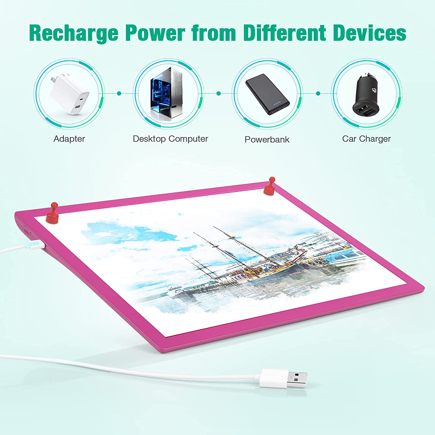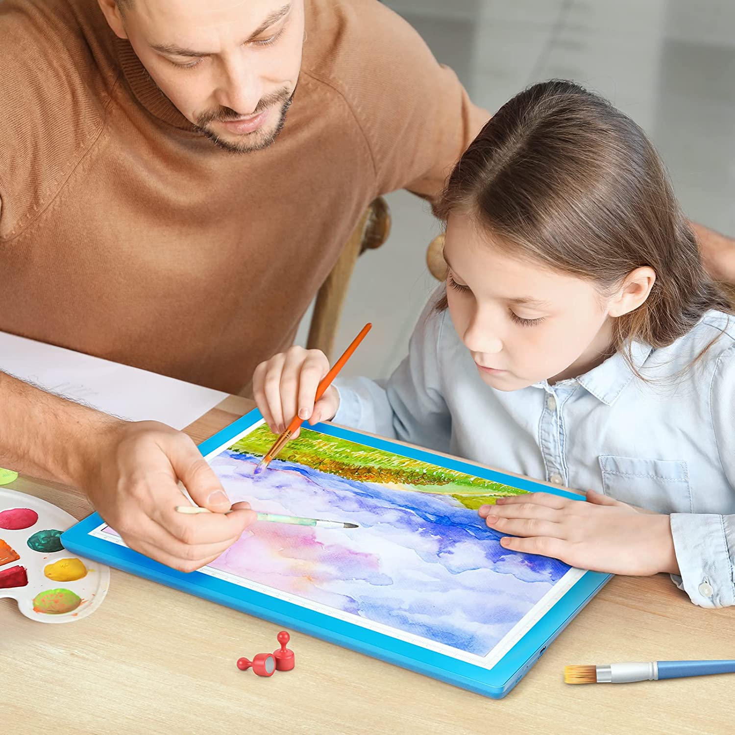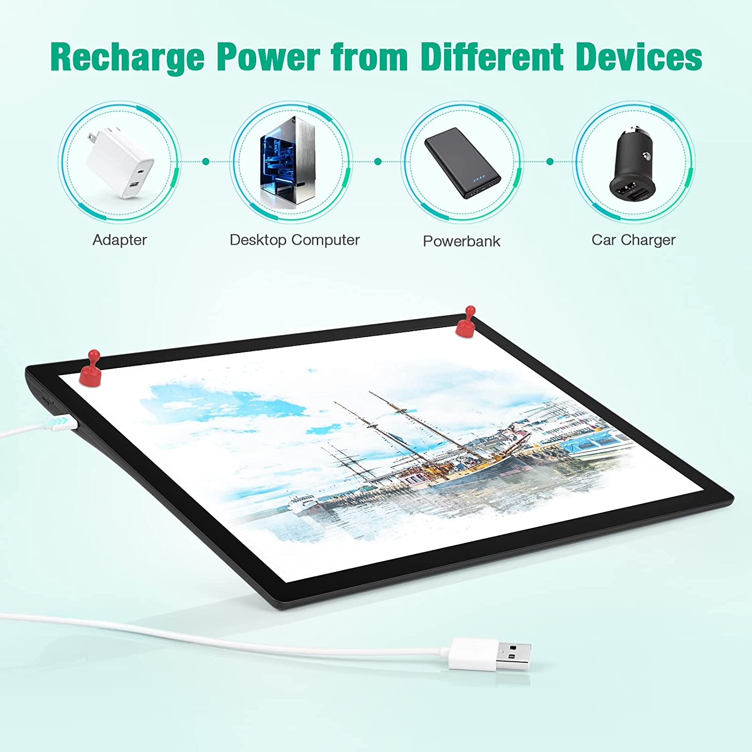 • 5 LEVELS BRIGHTNESS CONTROL: The brightness of the tracing light pad can be adjusted by 5 different levels to match the ambient brightness of your background. Soft light will not make your eyes tired after long-hour working, press and hold the button to adjust the brightness based on your comfort and need.