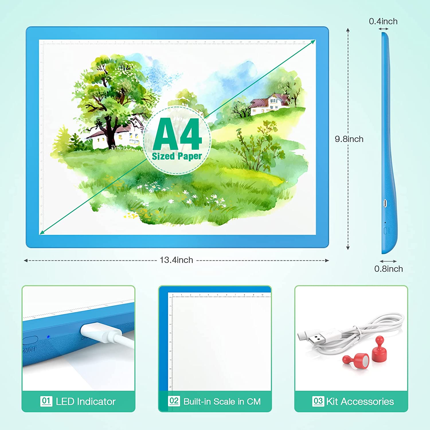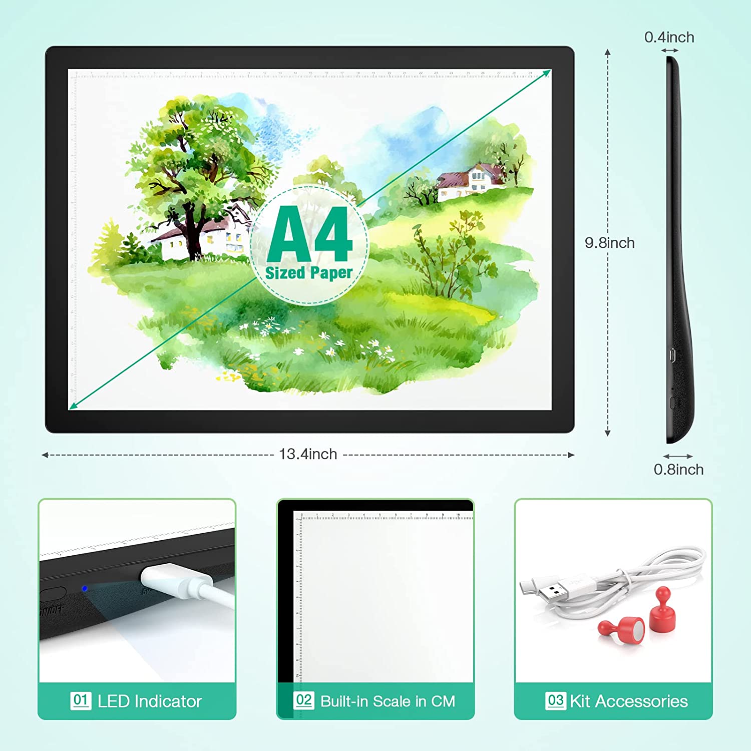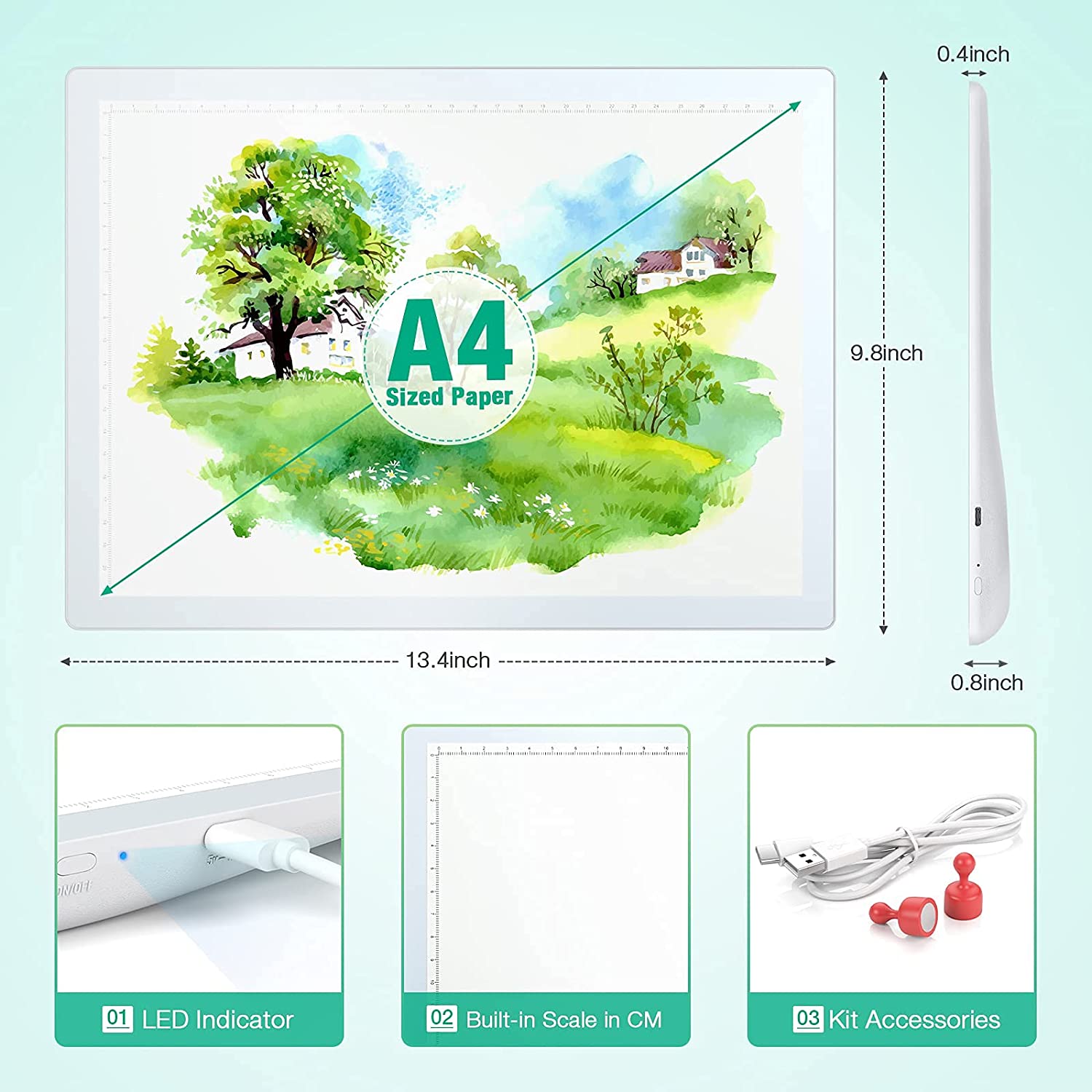 • SLIM AND PORTABLE: Wireless light tracking box can accommodate paper up to A4 in size, its slime design make it easy to carry outside. The ultra-thin and lightweight design with scale on border will make it easy for crafts to weed, sketch and draw.