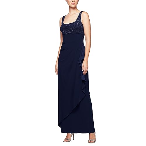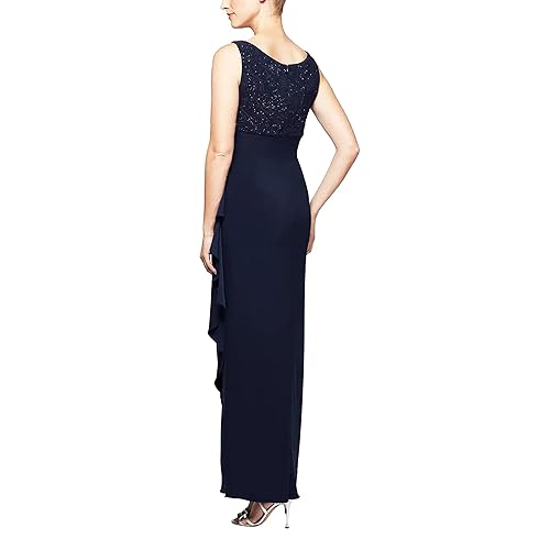 Details: Alex Evenings was founded on one simple idea: that eveningwear should reflect YOU, the amazing woman wearing it. Long embroidered scoop neckline dress with ruched detail & slit knit skirt can be worn with the jacket for the perfect amount of coverage.