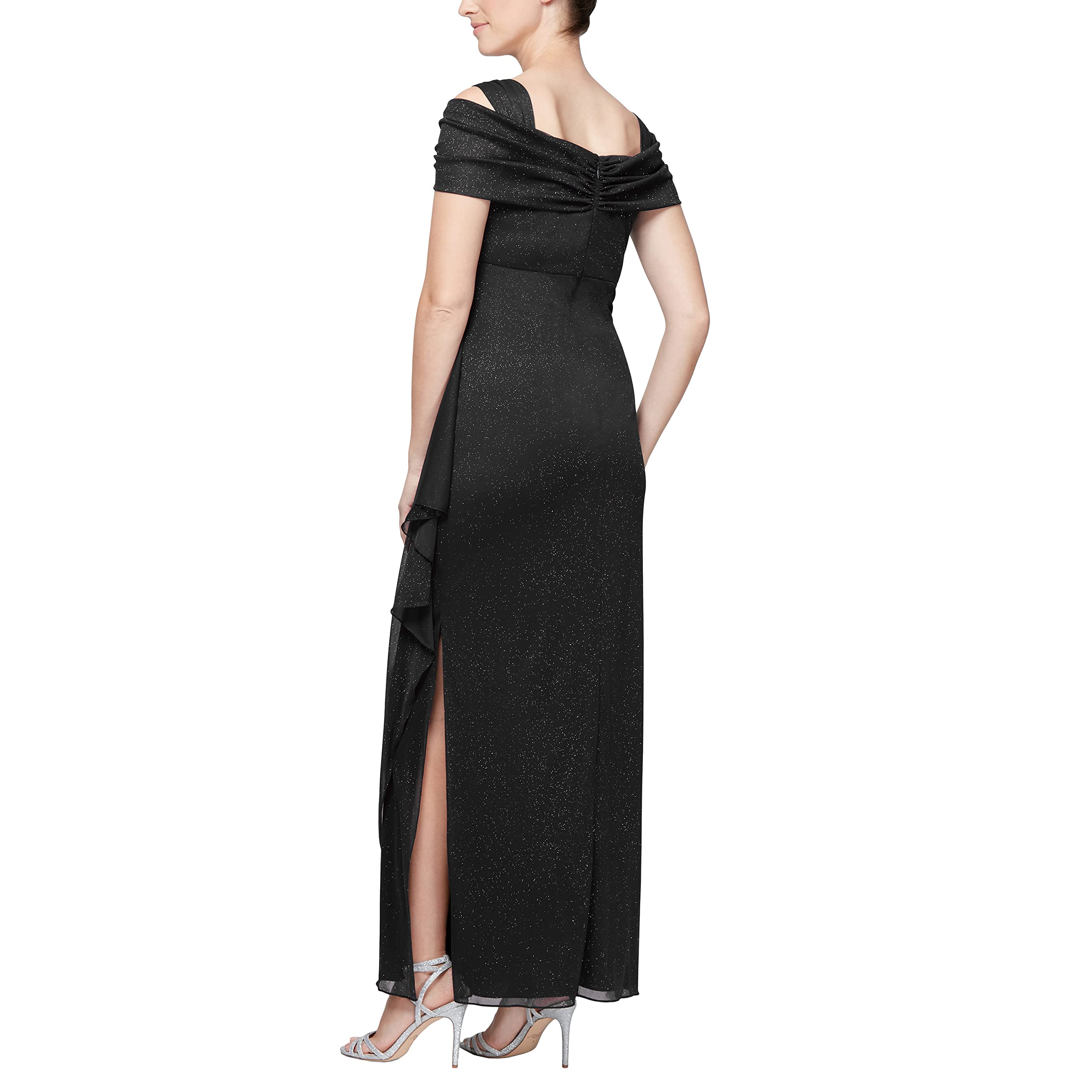 Details: Our long fit and flare cold shoulder evening gown with beaded applique at the waist is a stunning look for a mother of the bride, guest of wedding or perfect for any special evening event.