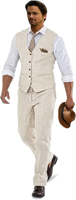 Furuyal Linen Suits for Men Casual Wedding Suits Men 2 Piece Suits Groomsmen Tuxedos Summer Beach Prom Vest and Pants Set