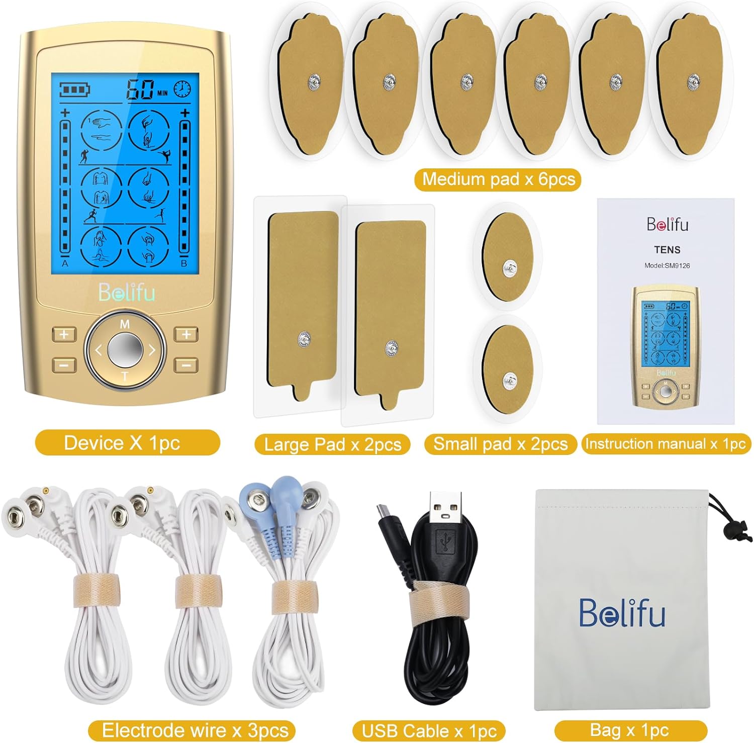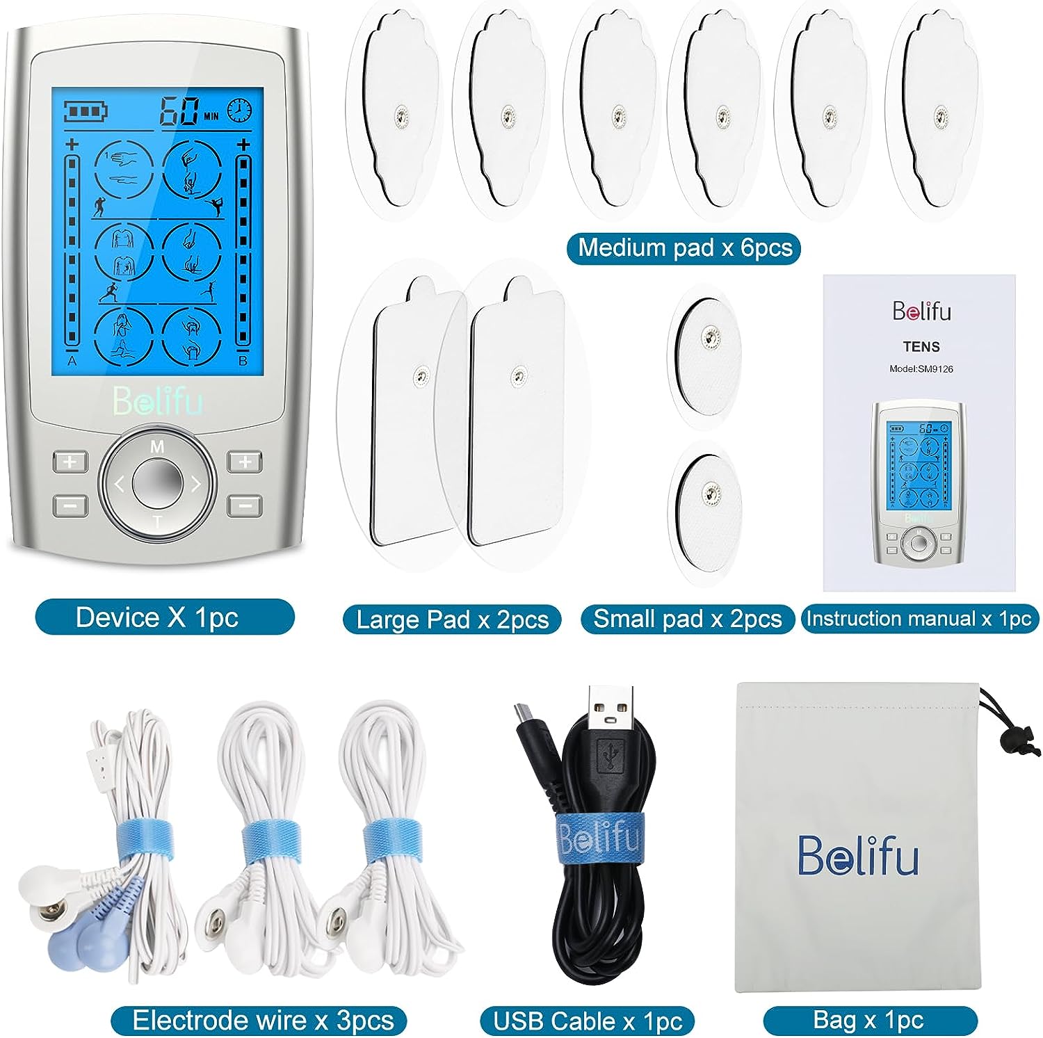 Belifu Dual Channel TENS EMS Unit 24 Modes Muscle Stimulator for Pain Relief Therapy, Electronic Pulse Massager Muscle Massager with 10 Pads, Dust-Proof Drawstring Storage Bag, Fastening Cable Ties