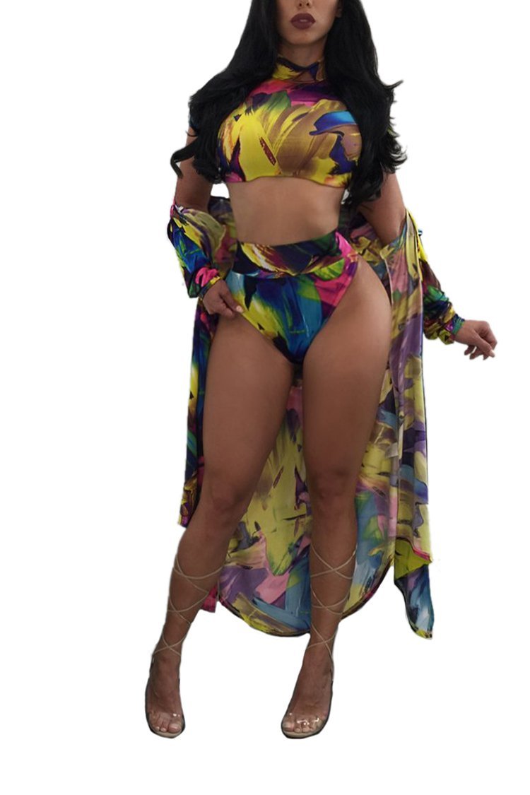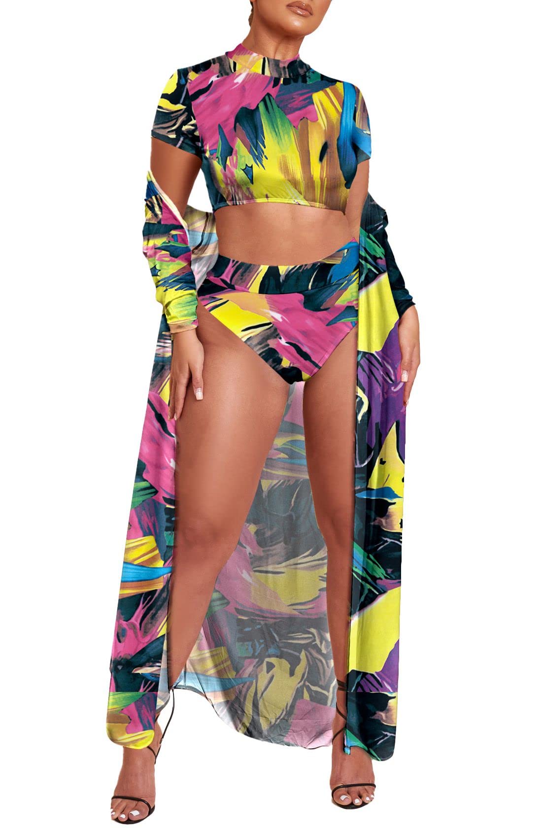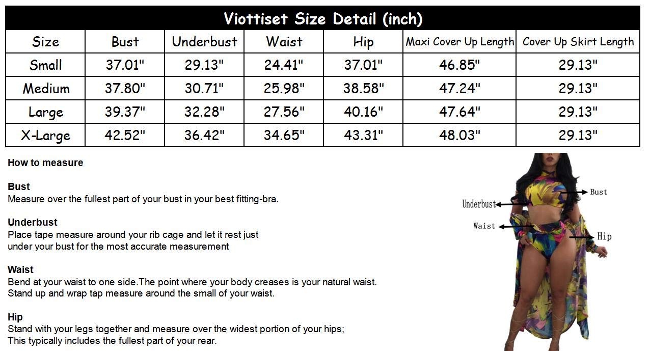 Viottiset Women's Leaf Printed Maxi High Waist Bikini Set with Swim Cover Up Dress