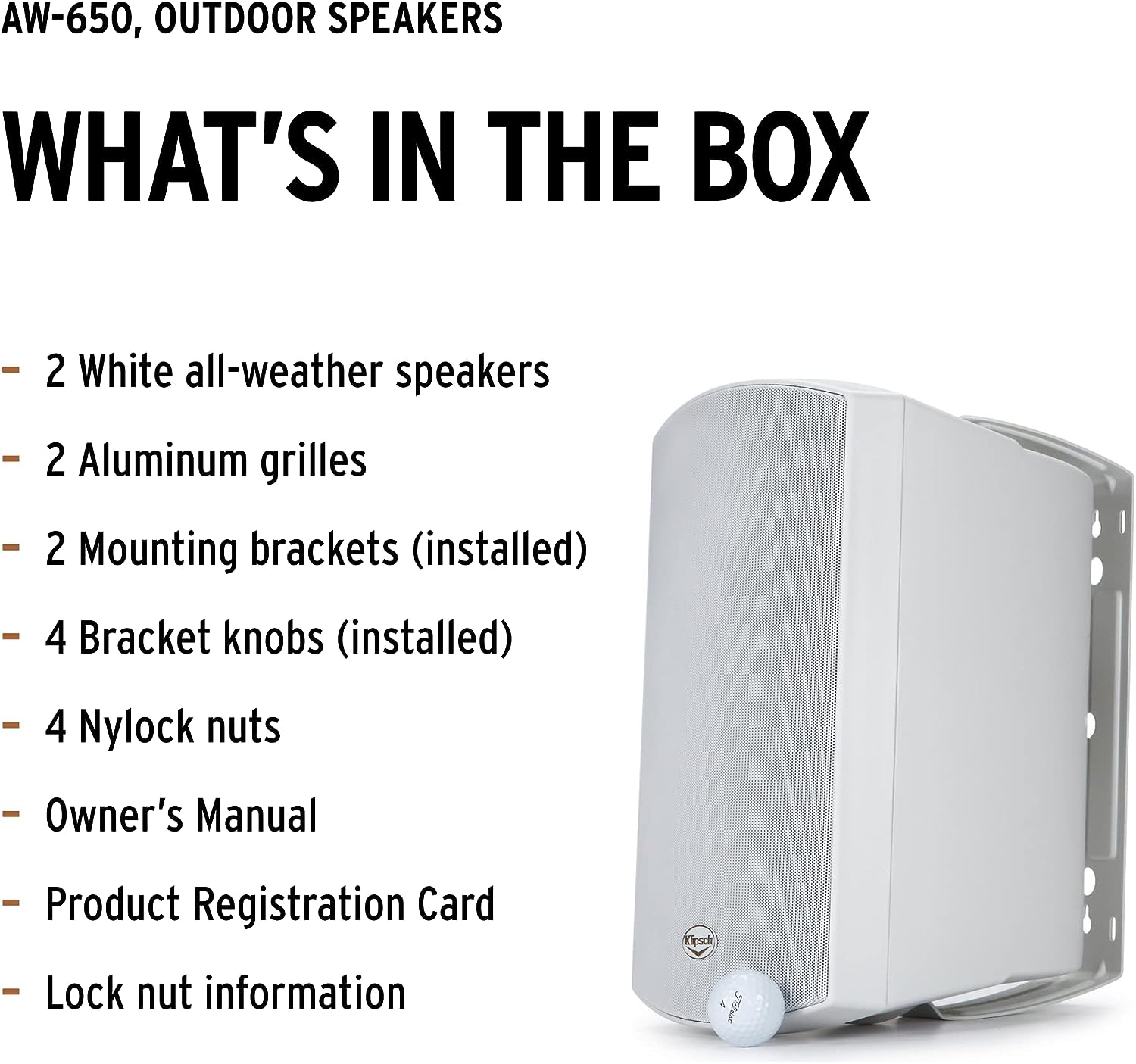 The durable Klipsch AW-650 all-weather loudspeaker brings clean, clear, dynamic sound and worry-free performance to the great outdoors. The AW-650 typically handles 85 watts of power at 8 ohms, with peak handling of 340 watts. Yet because it's so efficient, you get even more sound per watt, enabling this full-range model to work well in wide-open spaces.