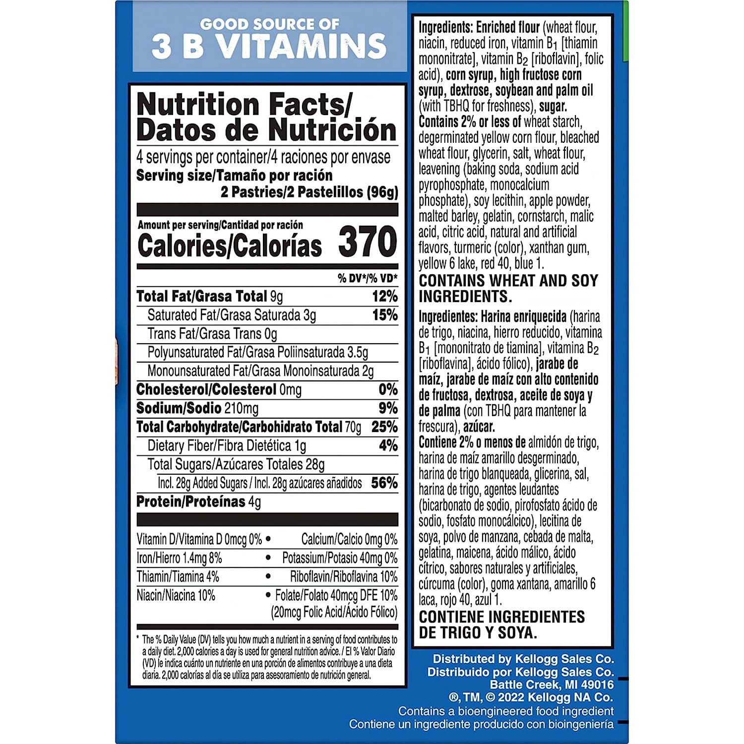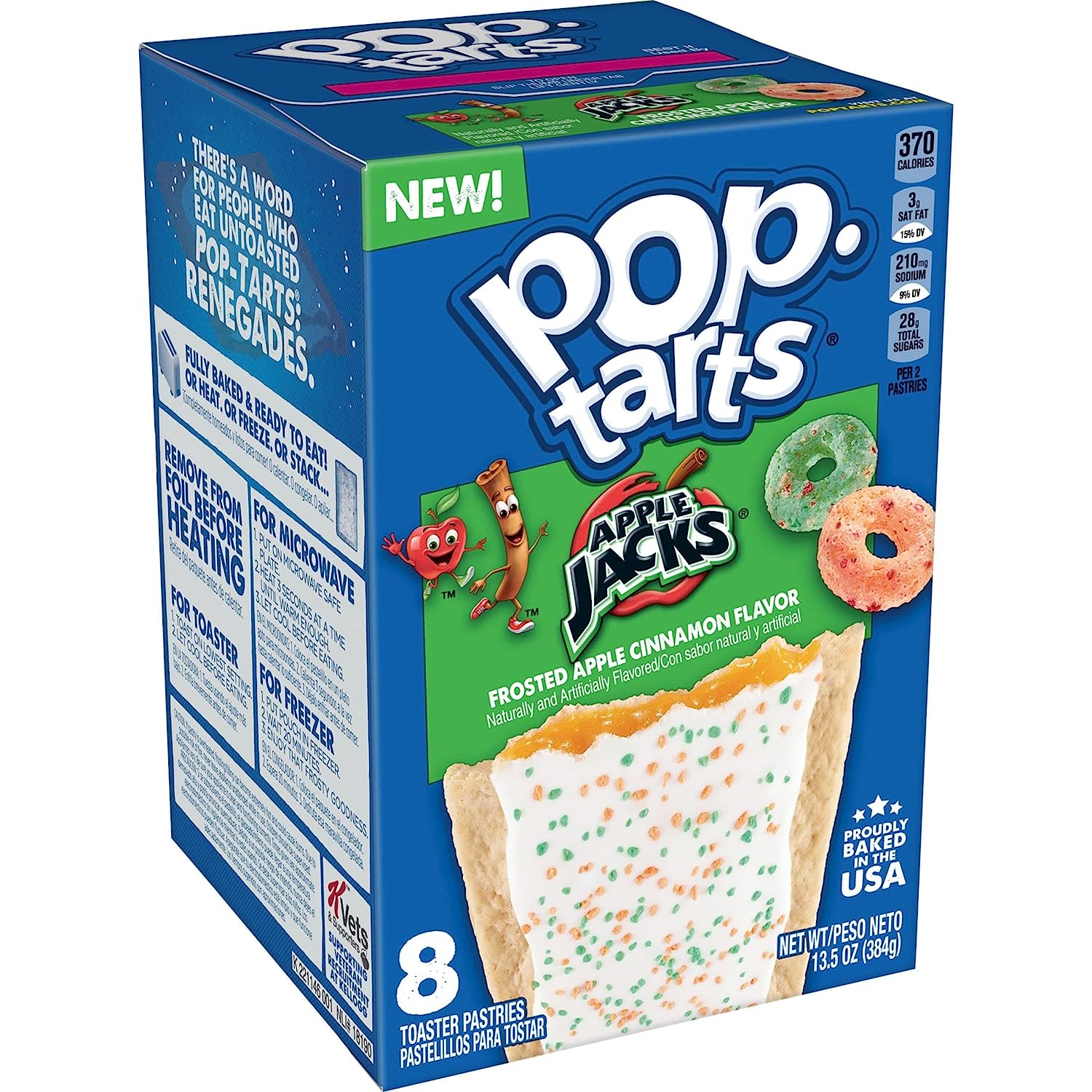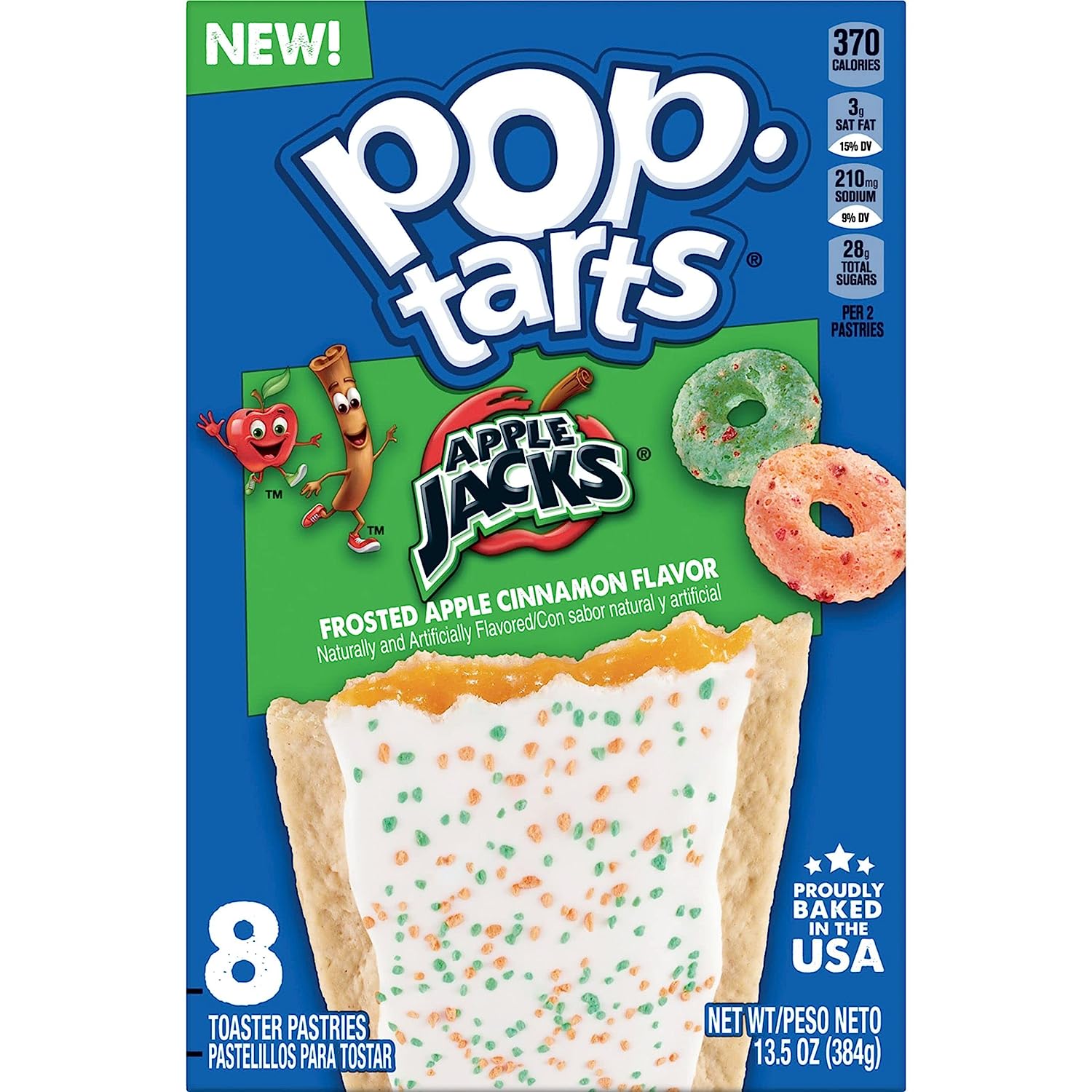 A combination of your favorite Kellogg's breakfast treats, Pop-Tarts Apple Jacks Frosted Apple Cinnamon Flavor Toaster Pastries make a delicious snack to look forward to any time of day. Jump start your day with a sweet and decadent blast of gooey Apple Jacks-inspired apple cinnamon-flavored filling encased in a pastry crust, topped with yummy frosting and crunchy sprinkles. They’re a quick anytime snack for the whole family; Pop-Tarts Toaster Pastries are an ideal companion for lunchboxes, after-school snacks, and busy, on-the-go moments. Not just for mornings, the versatile deliciousness of Pop-Tarts fits into your lifestyle just about anywhere there's time for a snack. Store them in your desk drawer for a pick-me-up at the office, keep them on hand in your pantry, or in the car for a delicious snack on the road. Just pop them in your toaster for a crisp, warm crust, heat them in the microwave, or enjoy them straight out of the foil with a glass of ice-cold milk.