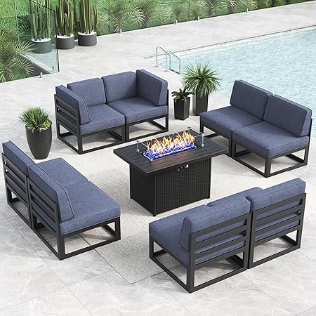 LayinSun Large Aluminum Patio Furniture Set with Fire Pit Table, 9 Pieces Modern Outdoor Conversation Set Sectional Metal Sofa Set with Olefin Cushion