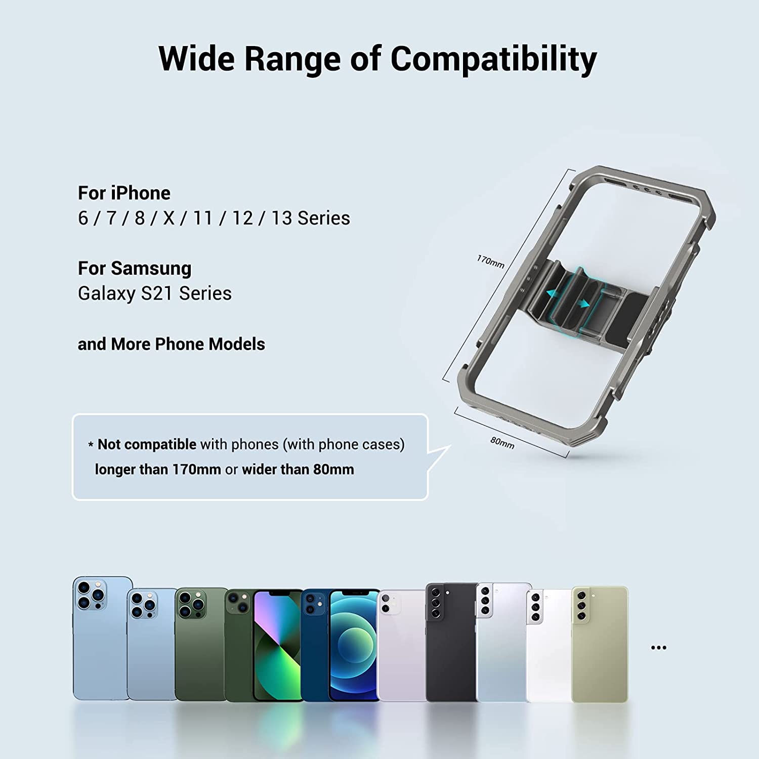 • 【Universal Phone Cage】 SmallRig Universal Video Kit for iPhone Series 3563 is a compact, multifunctional kit designed for professional videography, live streaming and vlogging.(Fits for iPhone 6, 7, 8, X, 11, 12,13/for Samsung:Galaxy S21 series/for HUAWEI:P40、P50 series, Mate 40 series)