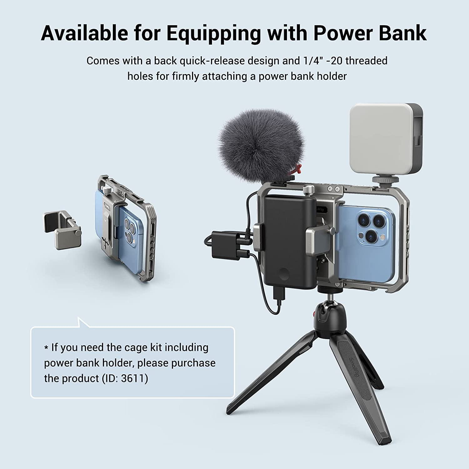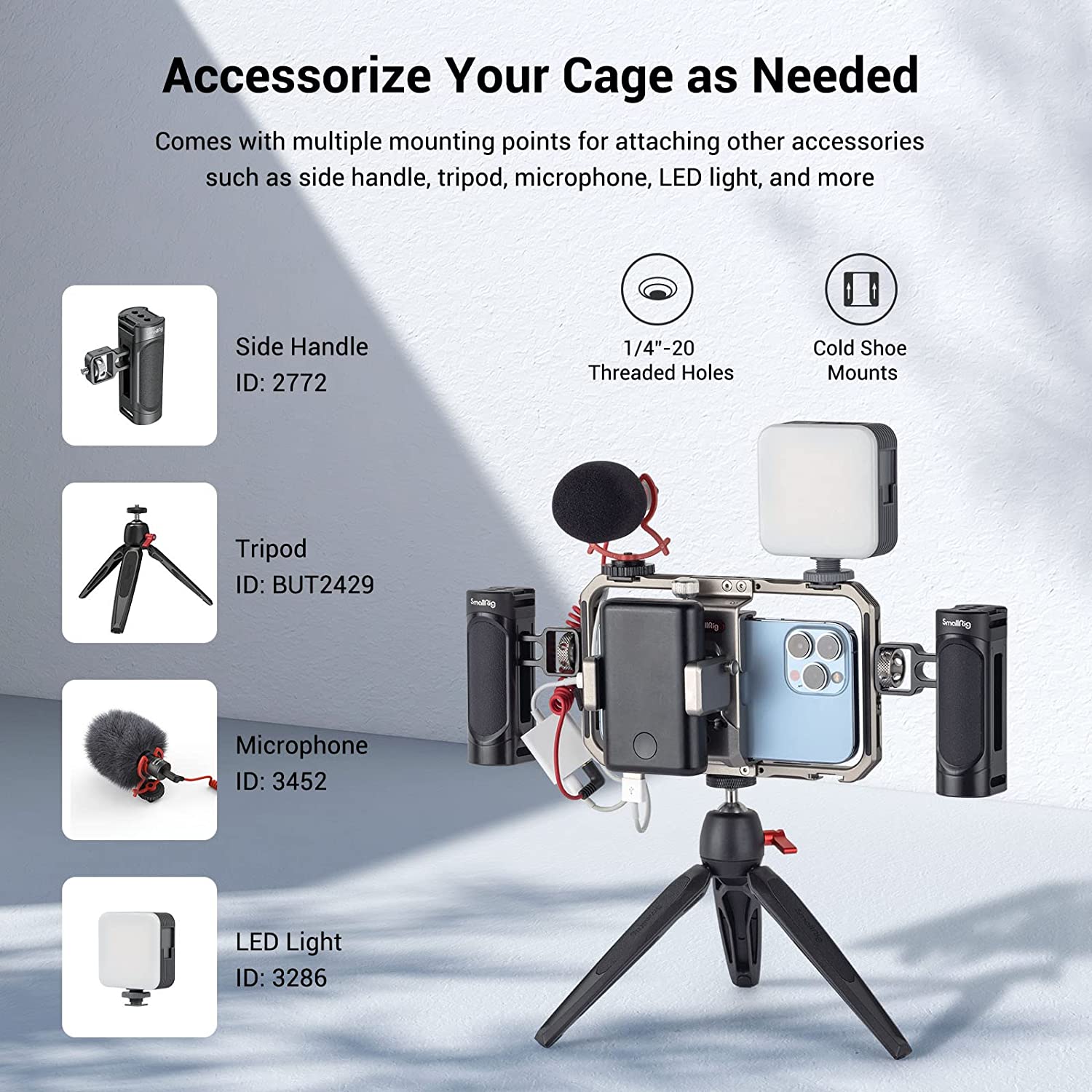 • 【Multiple Mounting Holes】 Comes with 1/4" -20 anti-twist threaded holes and cold shoes support accessories as Side Handle 3838 3894, Tripod BUT2664, Microphone 3452 and LED Light 3286. Making your smartphone videography more professional.