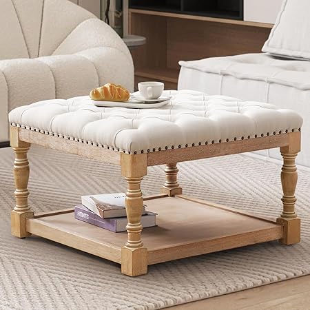 Large Square Ottoman Coffee Table, Oversized Footrest Upholstered Ottoman with Solid Wood Shelf and Frame for Living Room Bedroom- Ivory