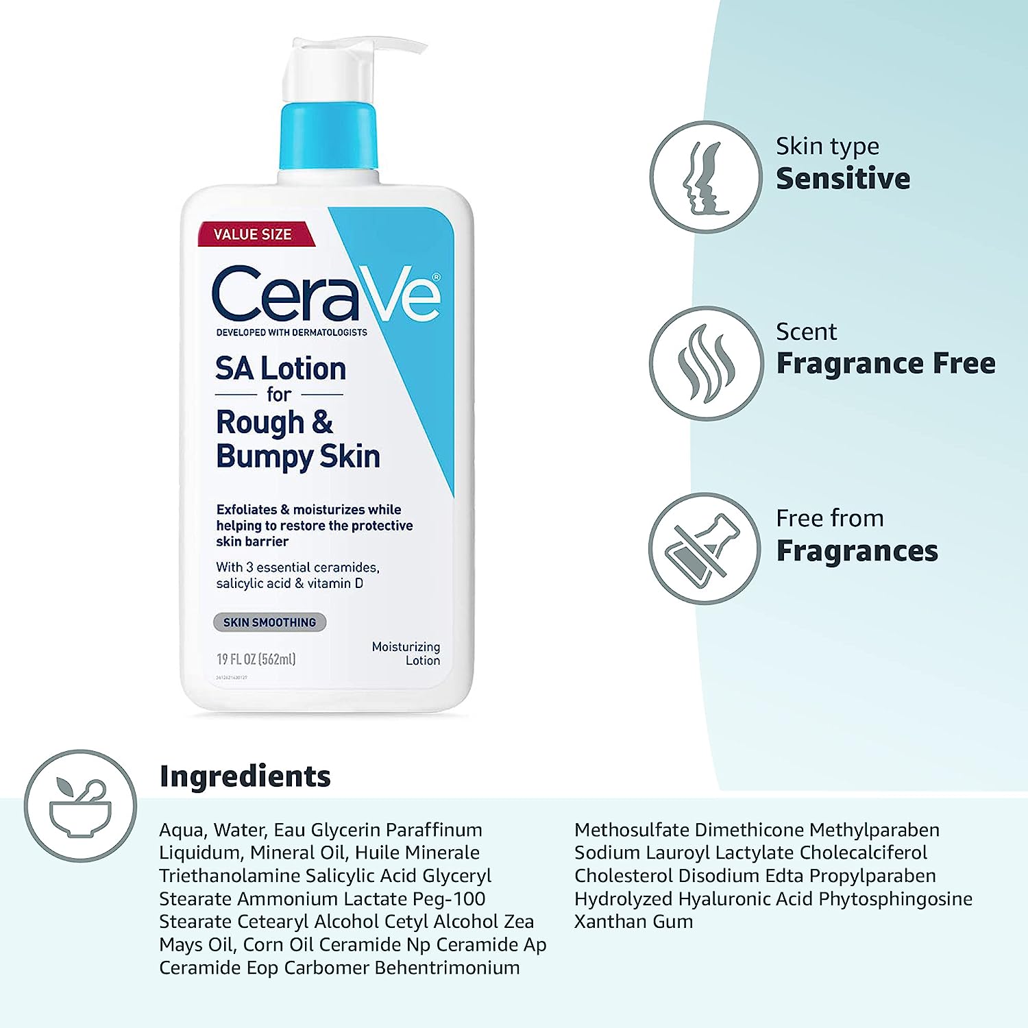 Developed with dermatologists, skin smoothing CeraVe Renewing SA Lotion has a unique lightweight formula that exfoliates and moisturizes while helping to restore the protective skin barrier. Salicylic acid exfoliates and softens to smooth rough skin, lactic acid exfoliates to renew skin’s surface and three essential ceramides (1, 3, 6-II) help to restore the protective skin barrier.