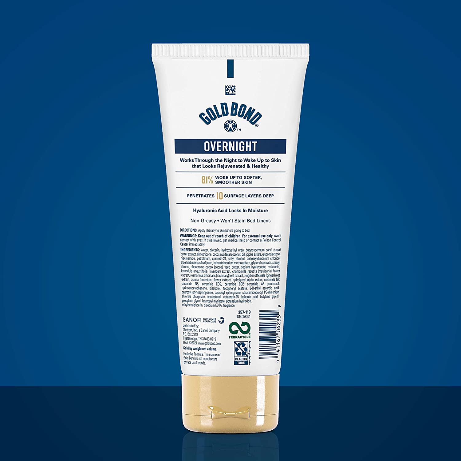 Hydrate and revitalize the look of skin while you sleep with Gold Bond Overnight Deep Moisturizing Skin Therapy Lotion. This overnight lotion contains hyaluronic acid to lock in moisture while you sleep so you wake up to skin that looks and feels rejuvenated. Its deep moisturizing formula with seven moisturizers and three vitamins penetrates 10 surface layers deep and reveals soft, supple skin. The lotion is non-greasy, so applying it before bed will not stain or damage your bed sheets. Breathe in the calming lavender scent and rest assured that the thick cream is working to revitalize the look of your skin. This Gold Bond formula is clinically tested, with 92% of users feeling an immediate difference in their skin. Your skin is a champion. One that never settles for silver. Gold Bond is high performance skin care for real life so you can be your best while keeping your skin at its best.