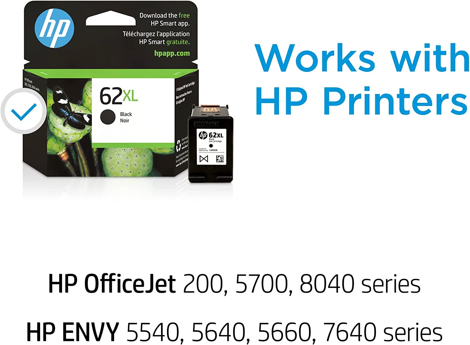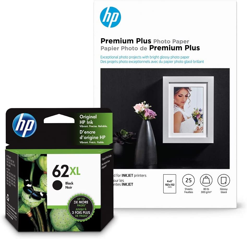 HP 62XL Black Ink Cartridge (C2P05AN) for HP ENVY 5540 5541 5542 5543 5544 5545 5547 5548 5549 5640 5642 5643 5644 5660 5661 5663 5664 5665 7640 7643 7644 7645 HP Officejet 200 250 258 5740 5741. HP 62 ink cartridges work with: HP ENVY 5540, 5541, 5542, 5543, 5544, 5545, 5547, 5548, 5549, 5640, 5642, 5643, 5644, 5660, 5661, 5663, 5664, 5665, 7640, 7643, 7644, 7645. HP Officejet 200, 250, 258, 5740, 5741, 5742, 5743, 5744, 5745, 5746, 8040. Cartridge yield (approx.): 600 pages. Get up to 2x the pages with Original HP XL ink cartridges compared to standard cartridges. Original HP ink cartridges: Genuine ink for your HP printer. Ensure that your printing is right the first time and every time with HP printer ink: 62 ink. Choose an ink replenishment service - Let your printer track usage and have ink delivered before you run out. Either reorder HP Genuine ink cartridges only when you need them through Amazon Dash Replenishment, or save up to 50% by paying for pages printed through HP Instant Ink. What's in the box: 1 New Original HP 62XL ink cartridge (C2P04AN). Color: Black.