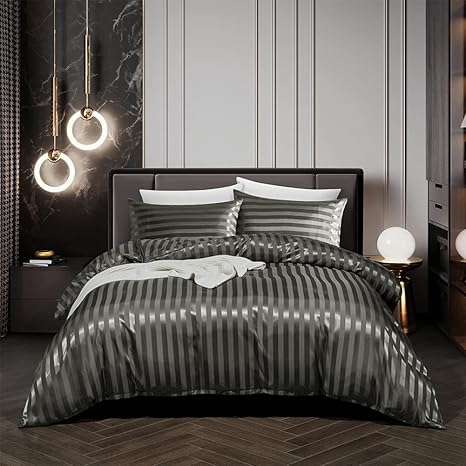 3 Piece Satin Duvet Cover Set Bedding Sets Italian Style 1800 Series Luxury Rich Silk Silky Super Soft Stripes Hidden Zipper Closure Reversible Wrinkle Free Honeymoon(Grey, Queen)