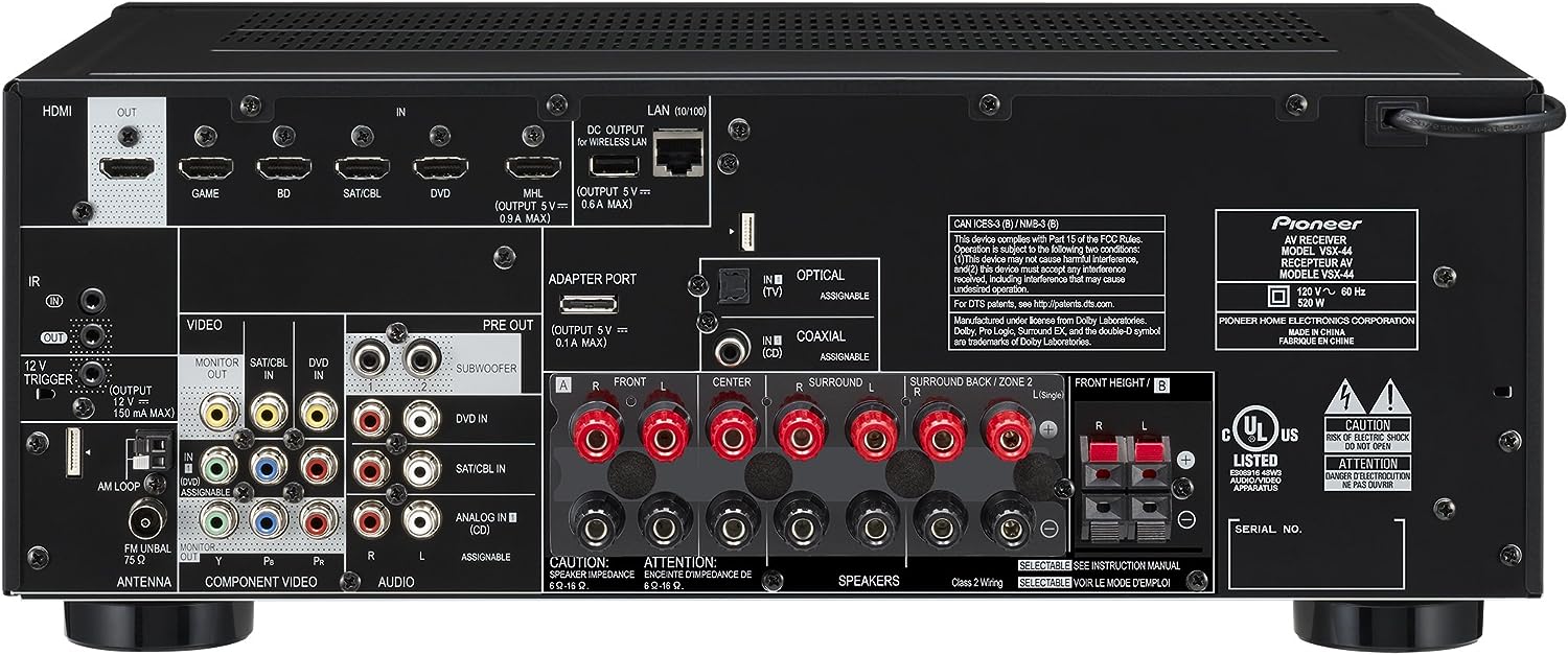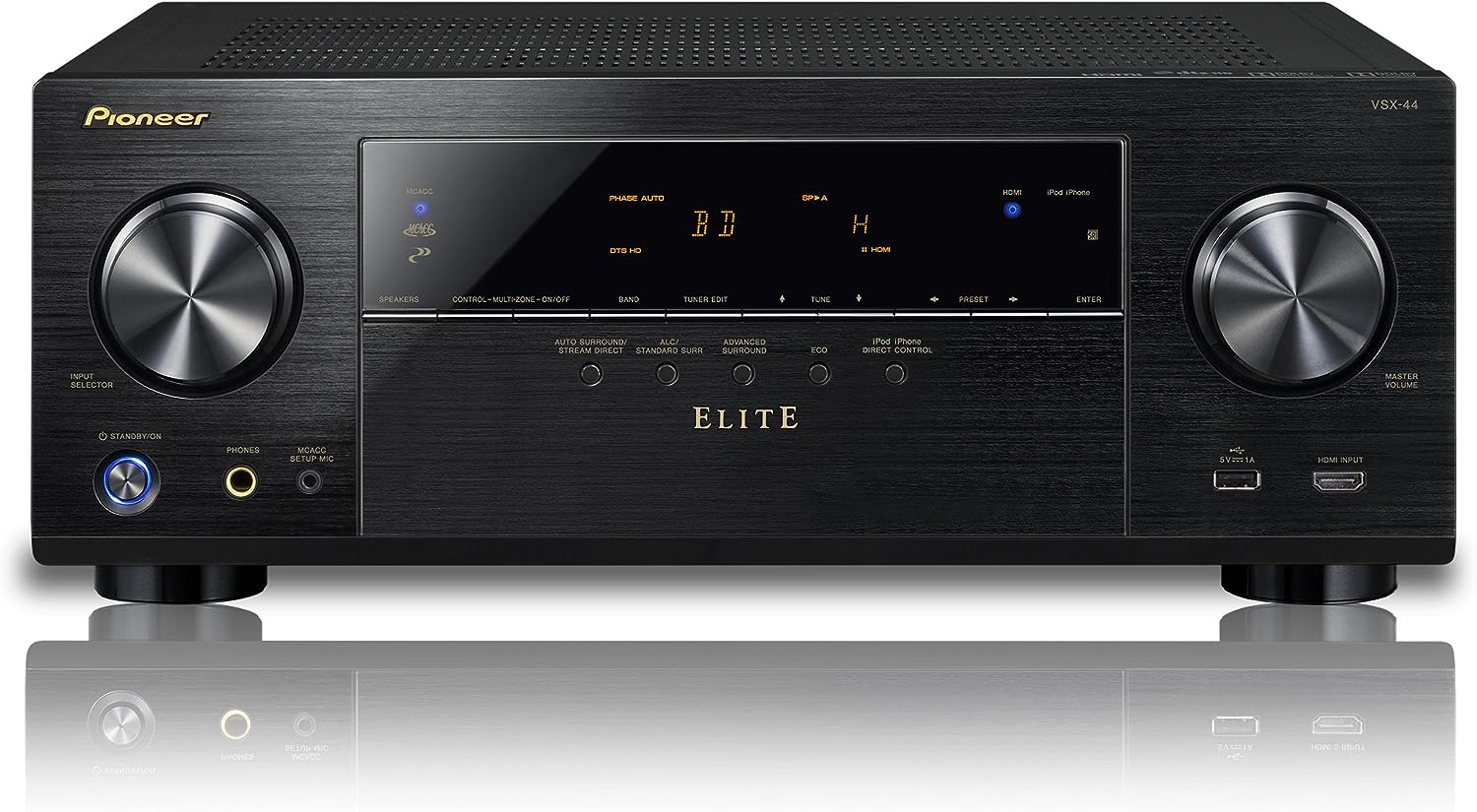 The all-new Pioneer Elite VSX-44 is a value-packed 7.2-channel AV receiver designed for the discriminating audiophile. Delivering 140 watts per channel (6 ohms 1 kHz 1 % 1ch Driven) or 80 watts per channel (20 Hz - 20 kHz, THD 0.08 % at 8 ohms FTC) of Elite power, the VSX-44 delivers an audio experience to rival bigger receivers. Its many advanced features include Ultra HD (4K/60p) Pass-through, Roku Ready, and it's Spotify Ready. Plus, the VSX-44 is one of the most versatile AV receivers for the Apple or Android platforms, letting you stream your favorite content, while you control the receiver from the palm of your hand.