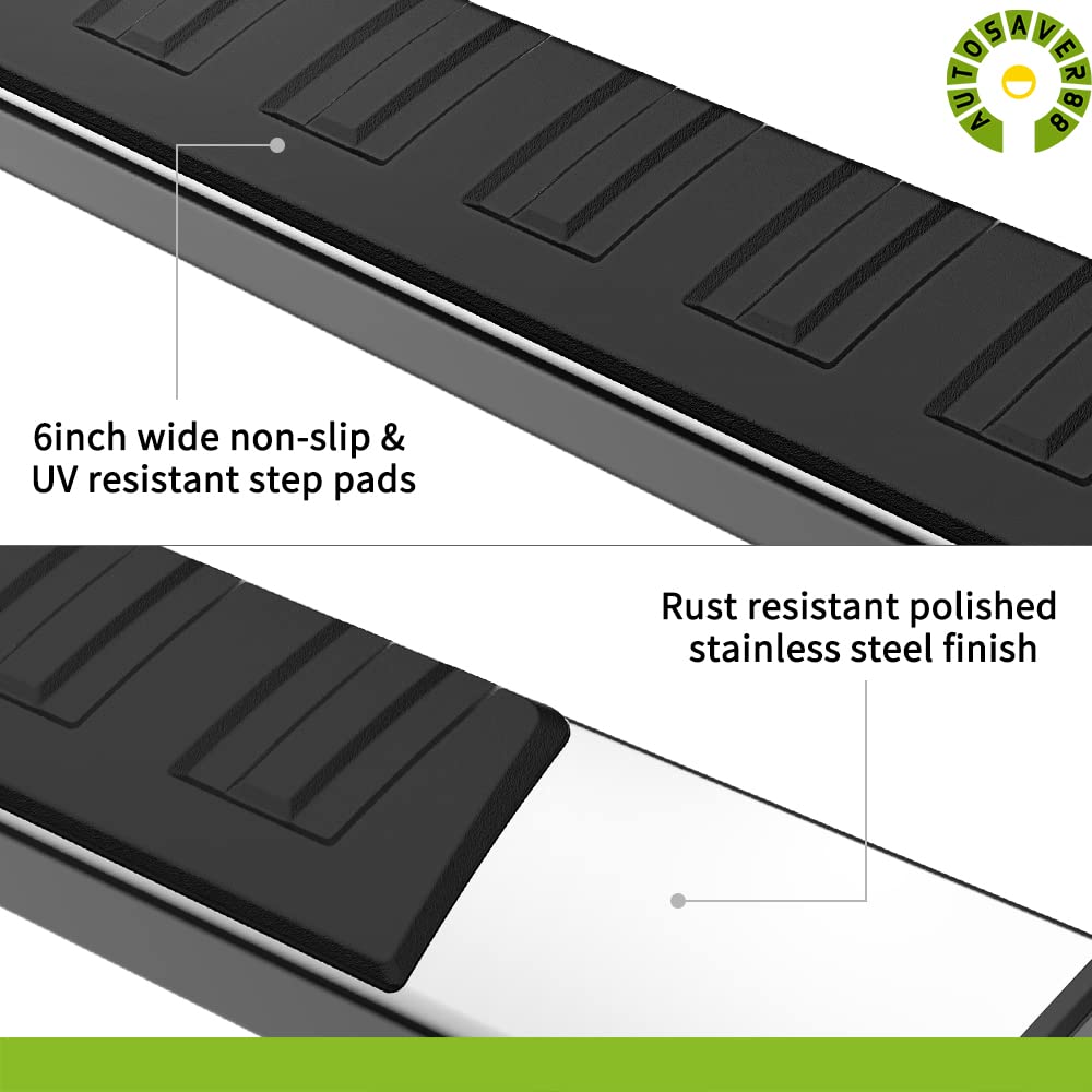 • SUPER QUALITY - The running boards' structure provides strength and durability. The 6-inch non-slip injection step pad allows easy movement such as stepping in, stepping out, and even jumping (450 lb. capacity)
