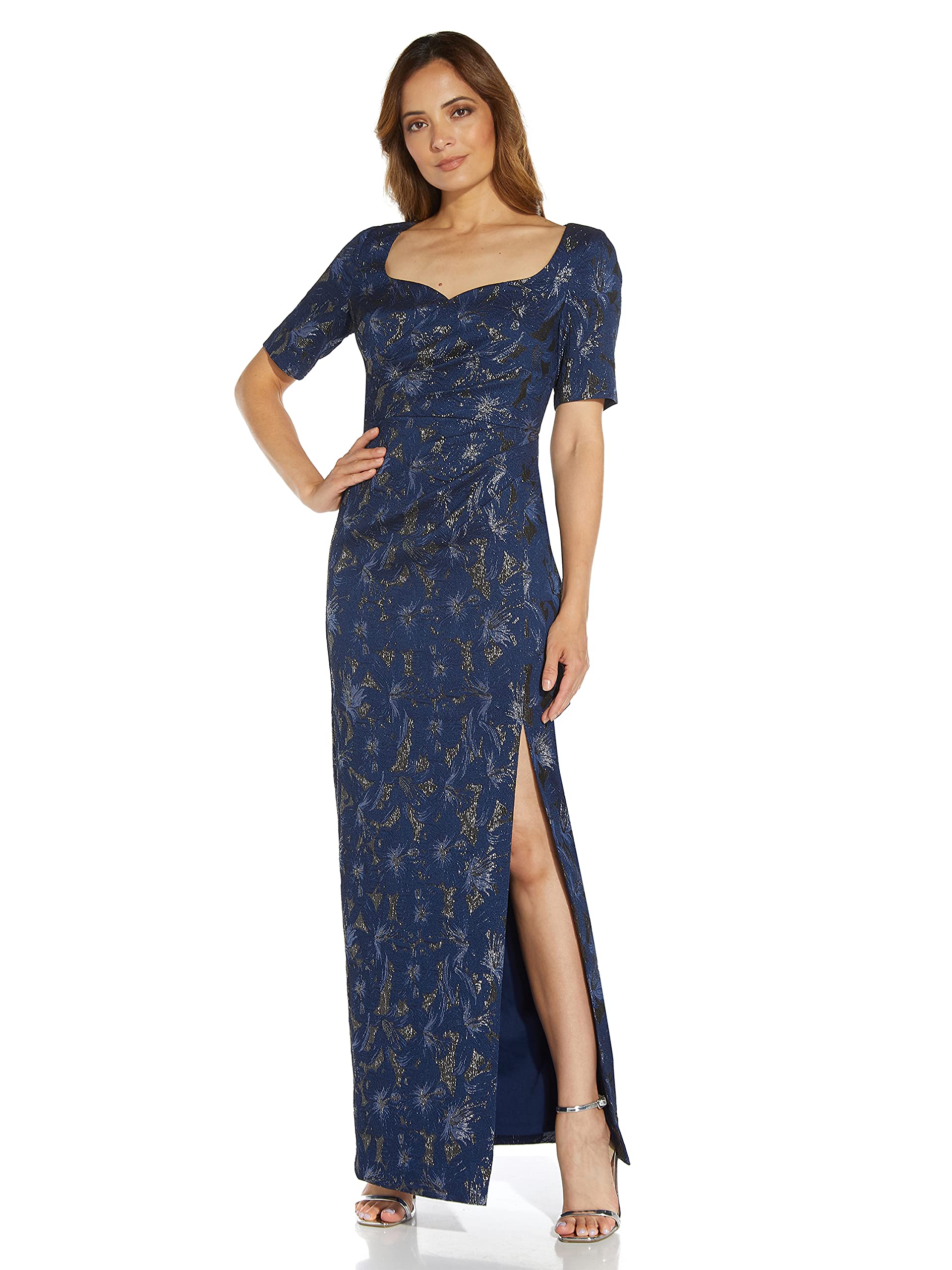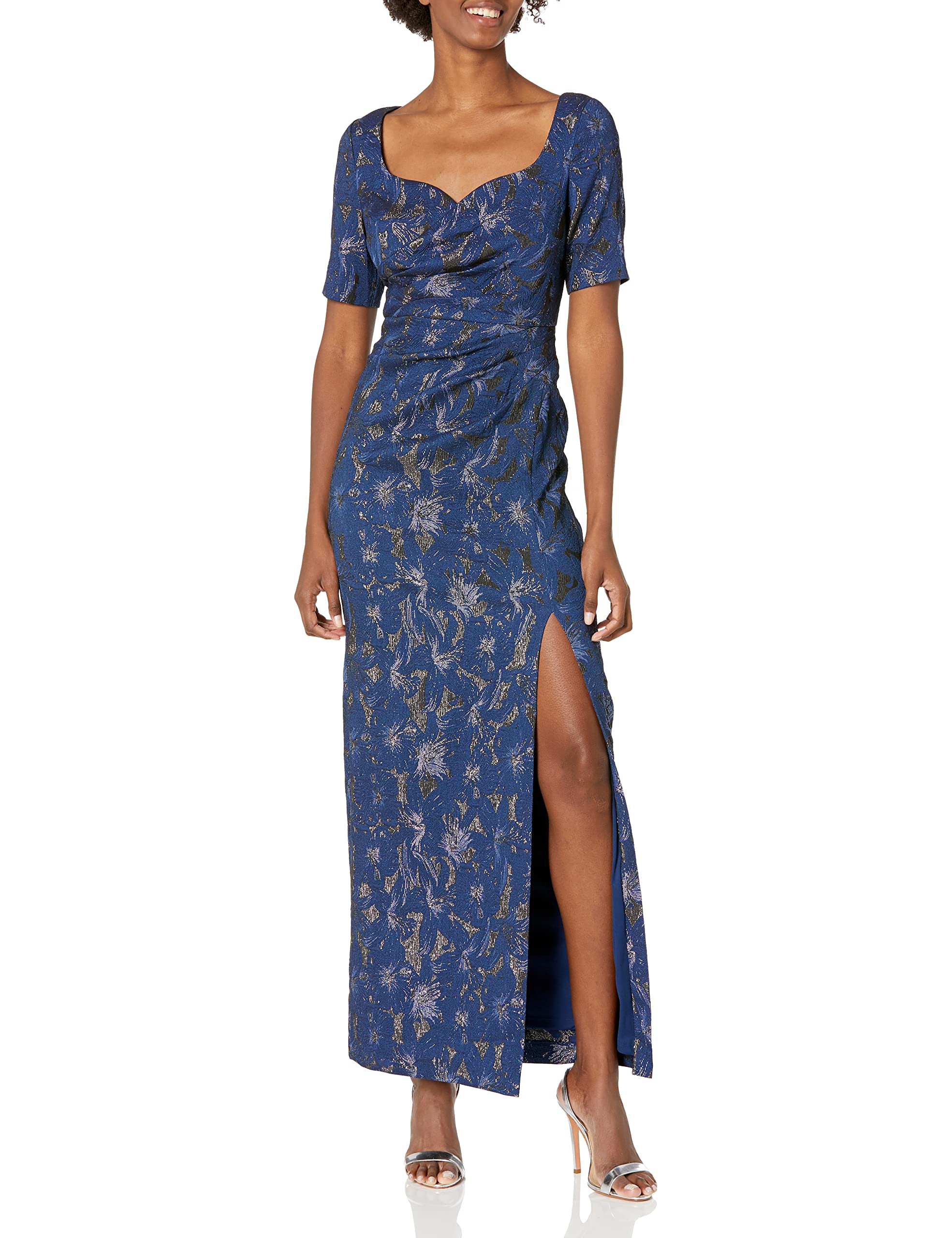 Details: Luxe jacquard in a streamlined column gown, with an ultra-flattering drape. We love this dress for its balance of structure and softness. Obsessing over: the floaty, floor-skimming skirt, modern angles, and forever-chic elbow sleeves.