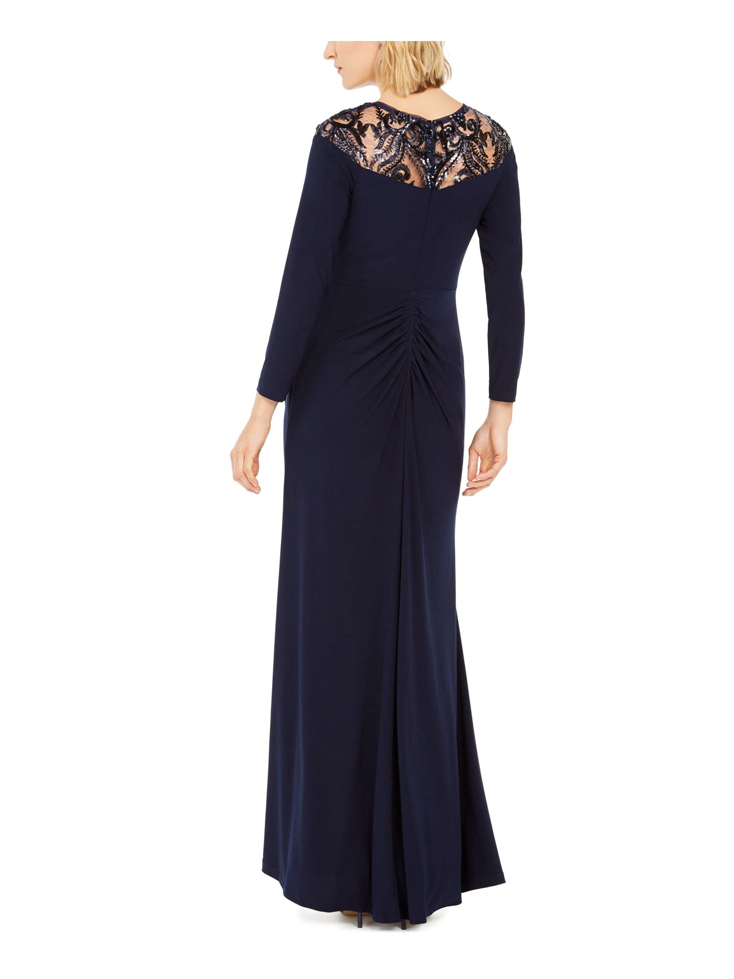 Details: This is a long draped jersey gown with round neck, short sleeves and a sequin yoke