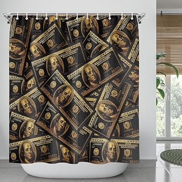 Benjamin Franklin 100 Dollar Bill Cash Theme Shower Curtain for Bathroom Black and Gold Fabric Shower Curtain Modern Luxury Art Decorative Bath Curtain for Bathroom with 12 Hooks
