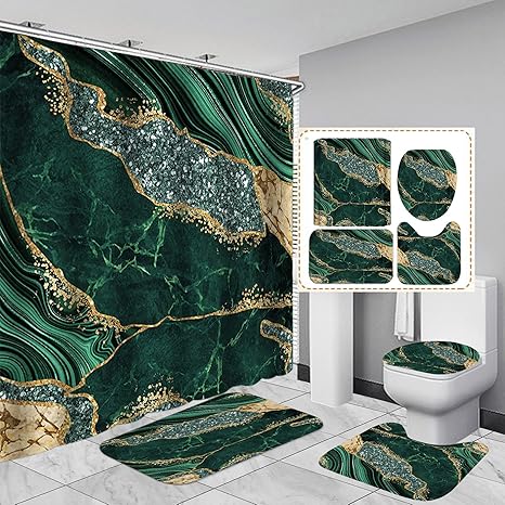 4PCS Marble Shower Curtain Sets, Modern Bathroom Sets With Toilet Lid Rug, Contour and Bath Mat, Luxury Bathroom Decor with 12 Hooks, 72 x 72 Inch, Green
