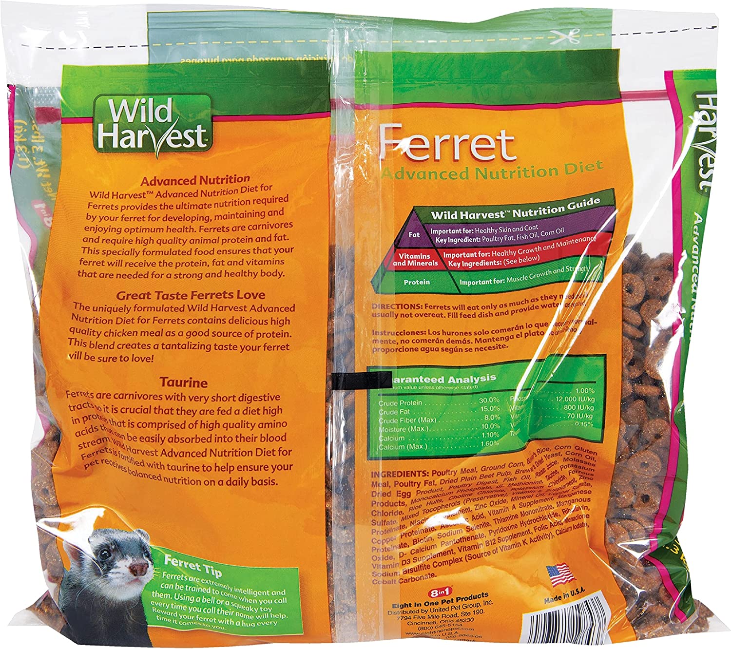 Ferrets are carnivores with very short digestive tracts so it is crucial that they are fed a diet high in protein that is comprised of high quality amino acids that can be easily absorbed into their blood stream. Similarly to cats, ferrets require taurine, which helps support healthy hearts and eyes. Wild Harvest Advanced Nutrition Diet for Ferrets contains high quality protein, as well as taurine, to help ensure your pet receives premium nutrition on a daily basis. Wild Harvest Advanced Nutrition Diet for Ferrets provides premium nutrition for developing, maintaining and enjoying optimum health. Ferrets are carnivores and require high quality animal protein and fat. This specially formulated food ensures that your ferret will receive the protein, fat and vitamins that are needed for a strong and healthy body. The uniquely formulated Wild Harvest Advanced Nutrition Diet for Ferrets contains delicious high quality chicken meal as a good source of protein. This blend creates a tantalizing taste your ferret will be sure to love!