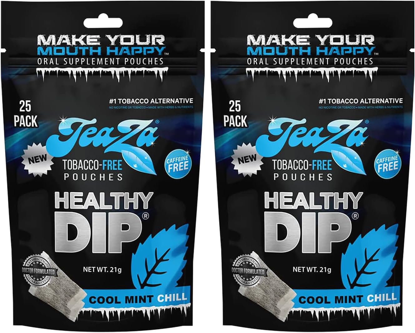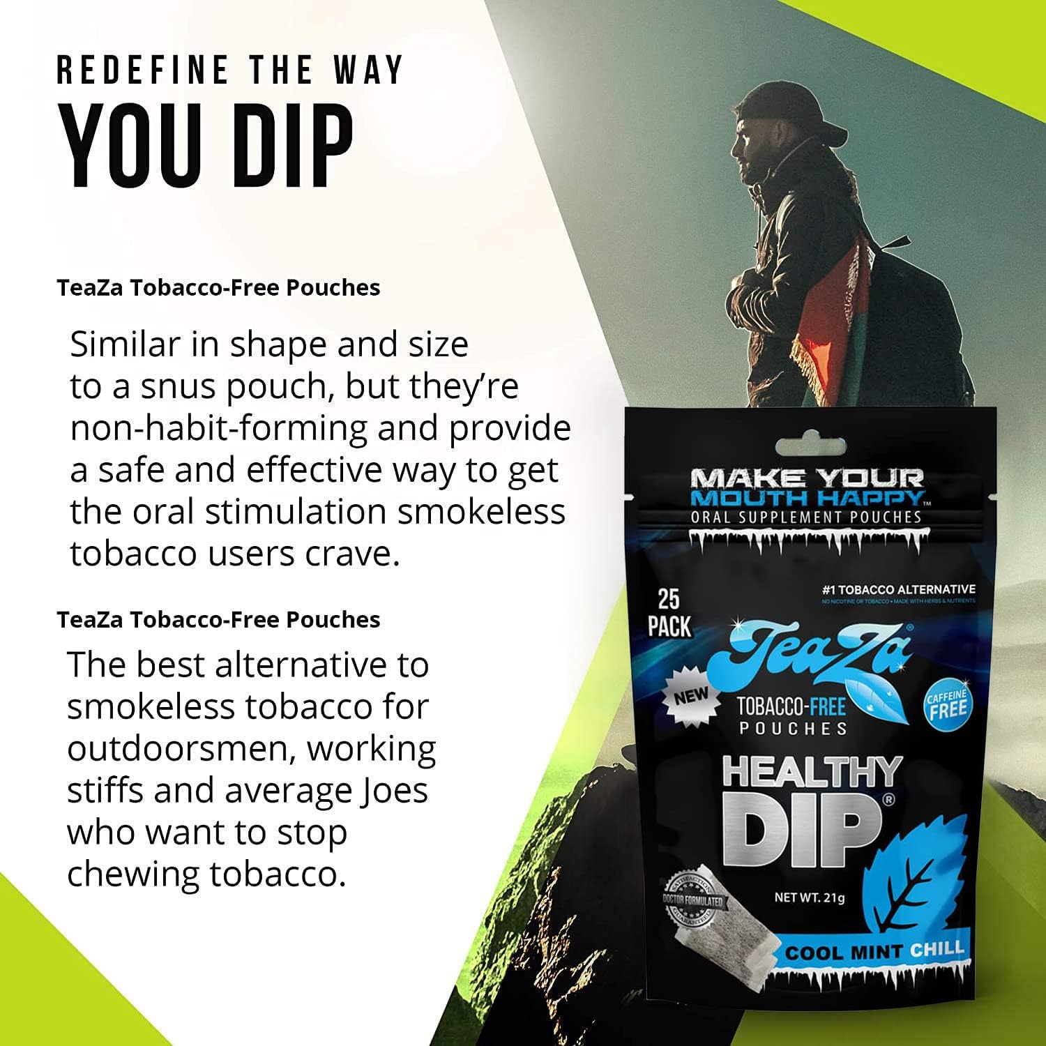 Teaza Herbal Energy Pouches Tobacco Alternative Nicotine Free Dip, Smokeless Alternative Snuff and Healthy Dip Pouches, Cool Mint Chill (2 Pack) Tobacco Free Chew Premium Crisp Minty Flavor